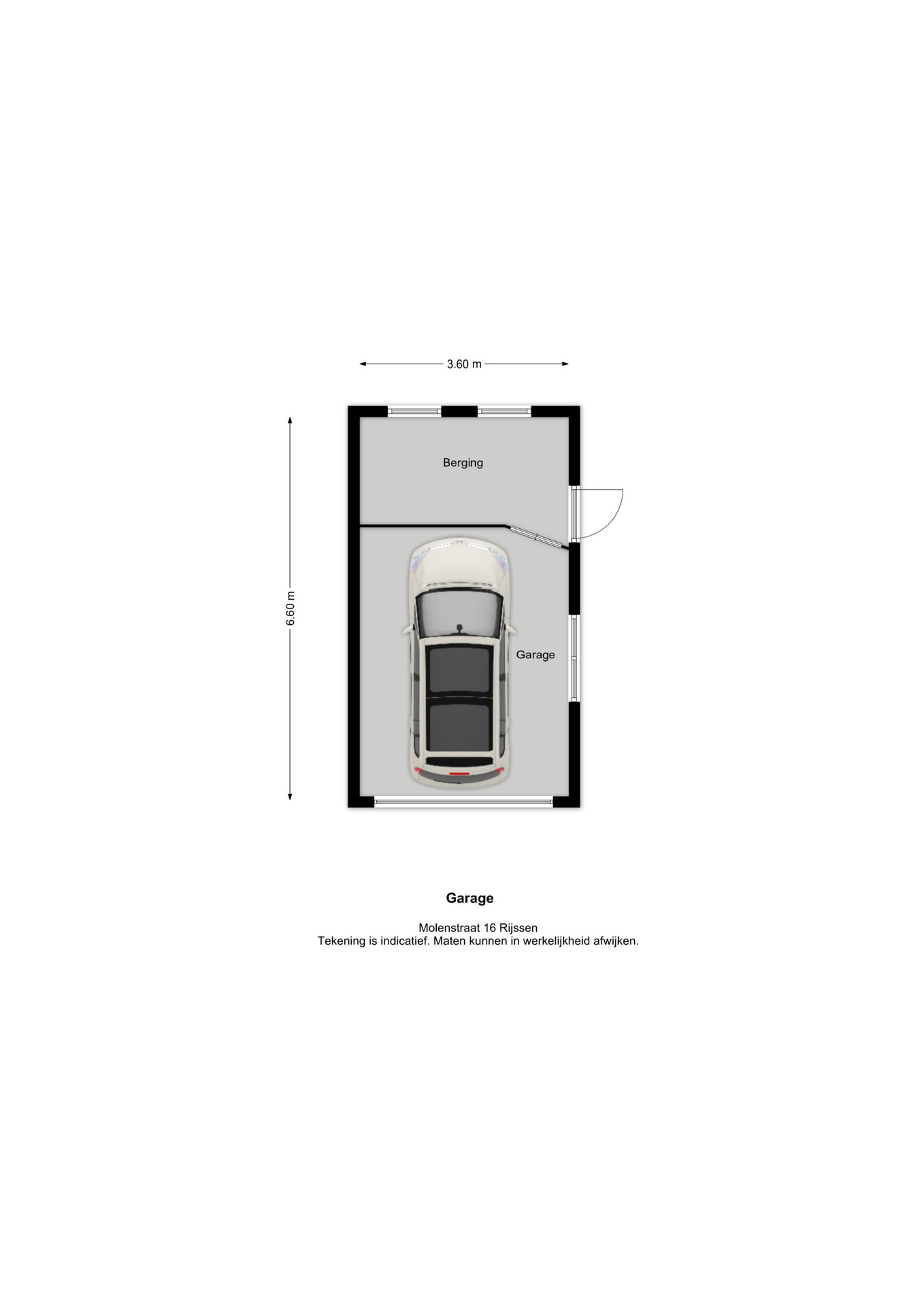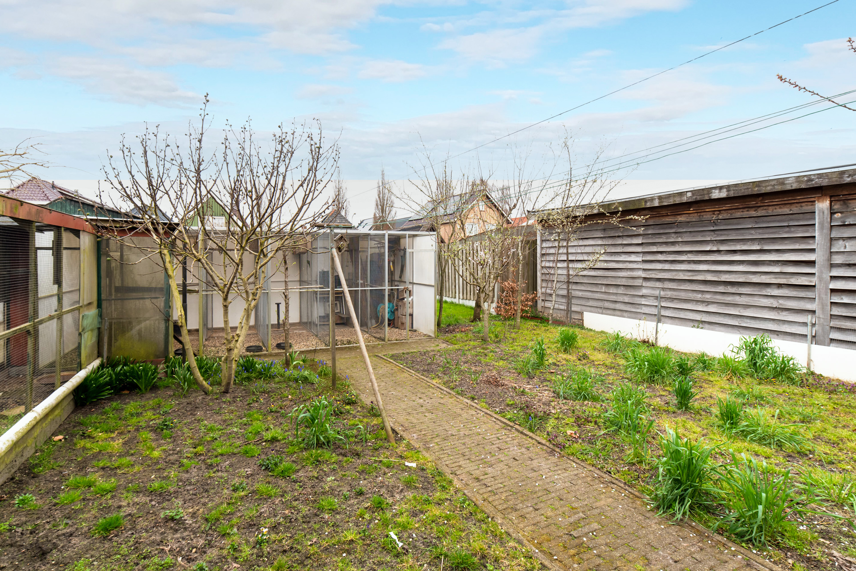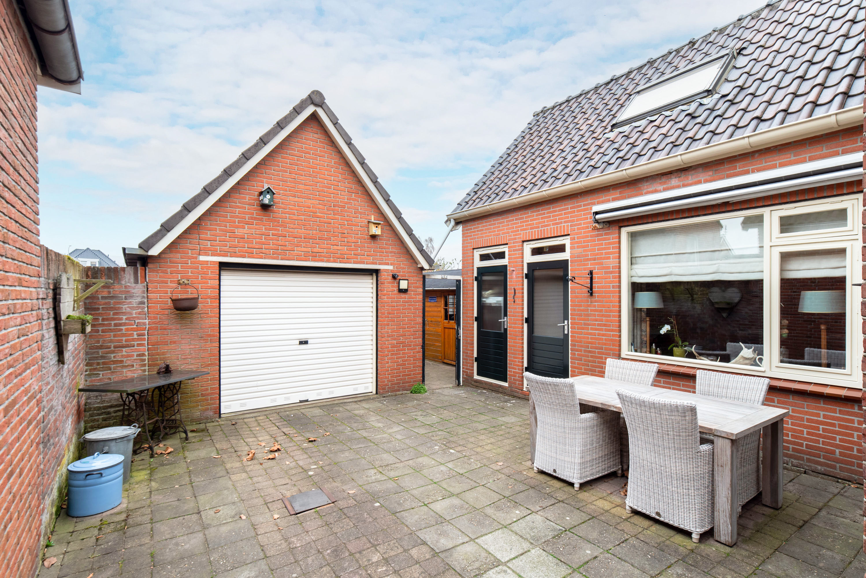 De tuin beschikt over een betegeld terras, een volière en een groenstrook waar je jouw groene vingers alle ruimte kunt geven. Via de tuin bereik je de garage met berging; een ideale ruimte voor hobby’s, opslag of als extra bergruimte.