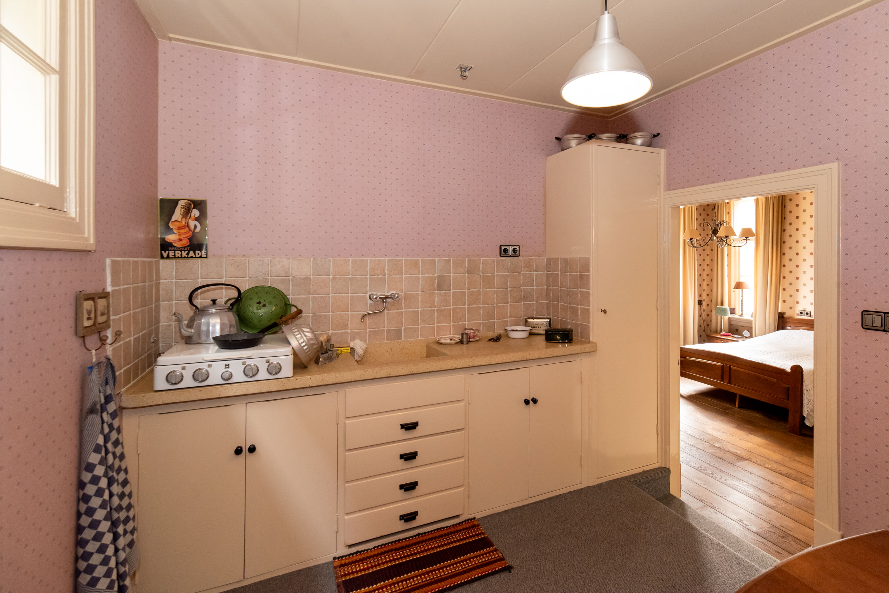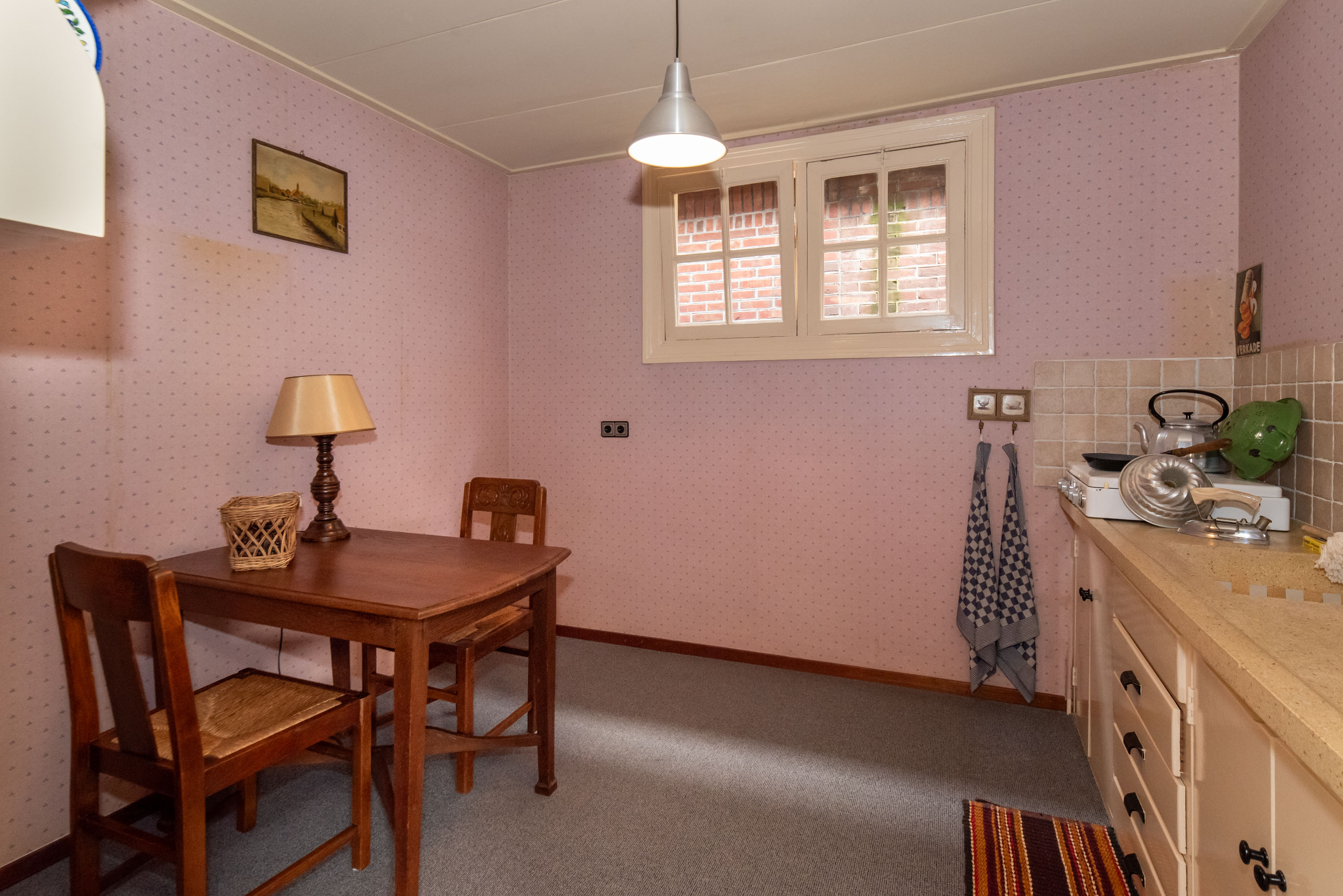 De woonkamer aan de voorzijde is momenteel ingericht als slaapkamer en beschikt over een toegangsdeur naar de keuken. Het keukenblok is voorzien van kastruimte en losse apparatuur, waaronder een gaskookplaat.