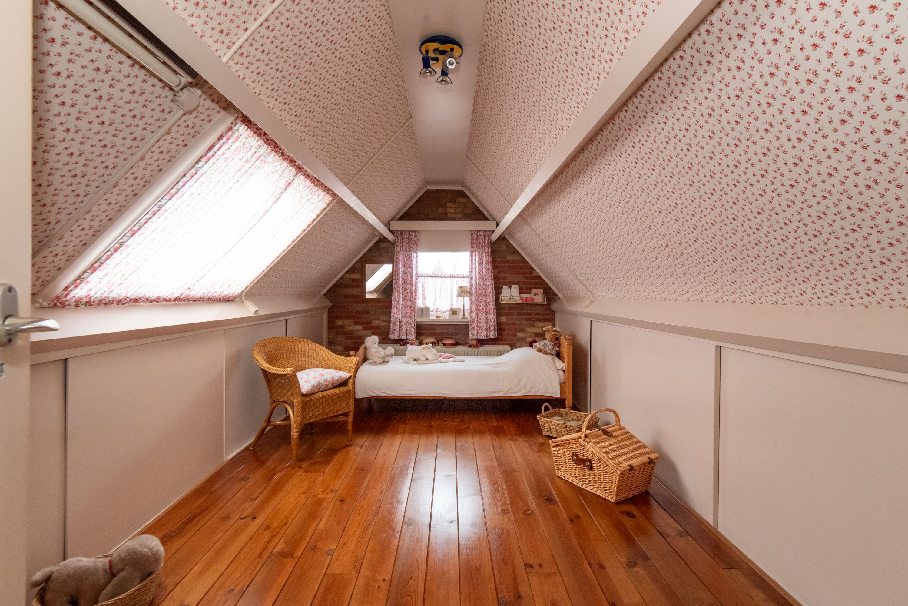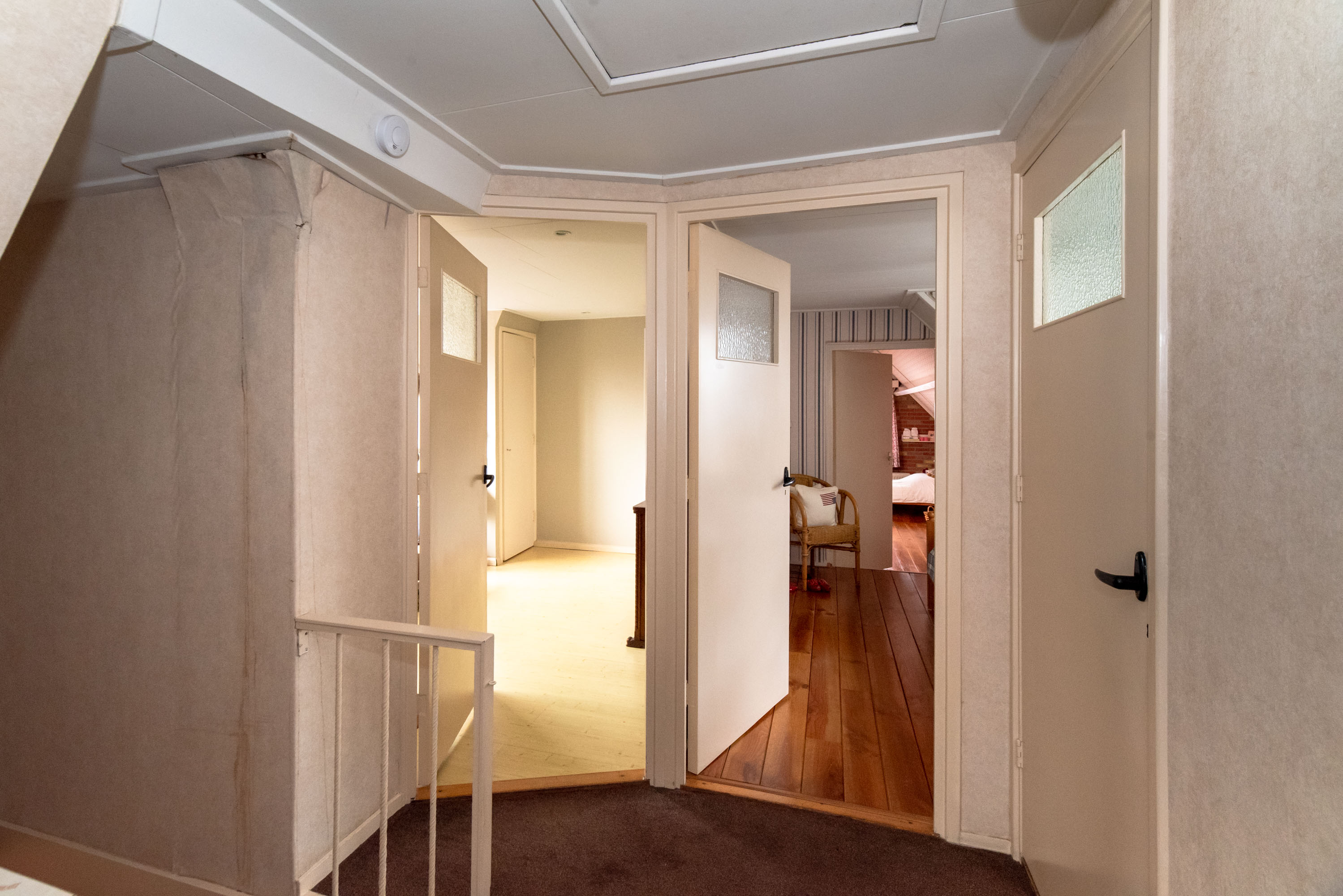 Op de eerste verdieping bevinden zich vier slaapkamers, waarvan twee zijn voorzien van een vaste kast. Via de overloop bereik je de badkamer, die is uitgerust met een wastafel en douche.
