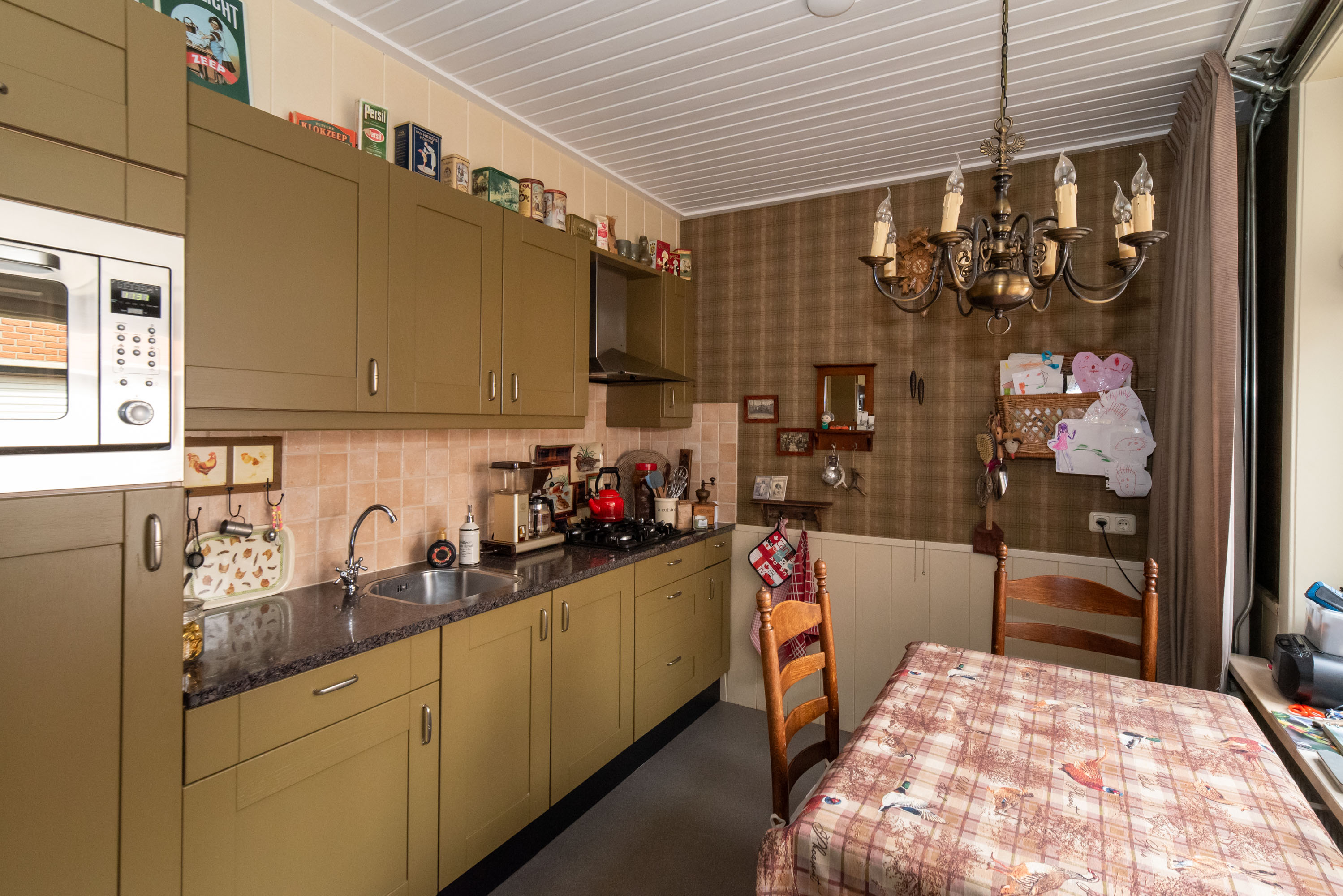 Via de woonkamer aan de achterzijde bereik je de tweede keuken en het portaal naar de bijkeuken. Het tweede keukenblok beschikt over kastruimte en inbouwapparatuur, waaronder een koelkast, combimagnetron en gaskookplaat. In de bijkeuken bevinden zich de wasmachineaansluiting, de cv-ketel en de deur naar de tuin.