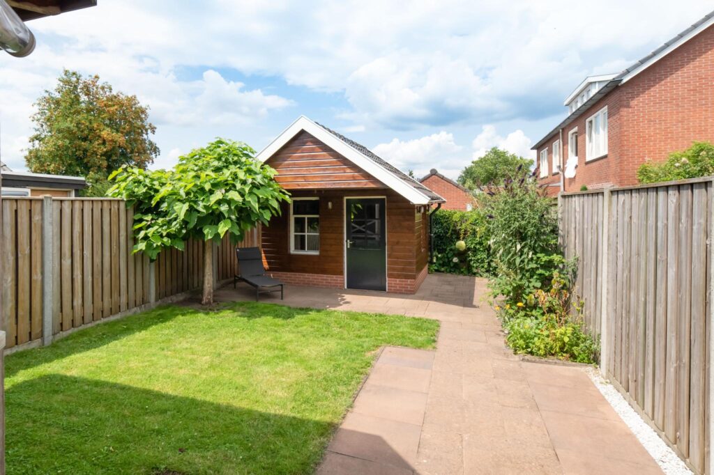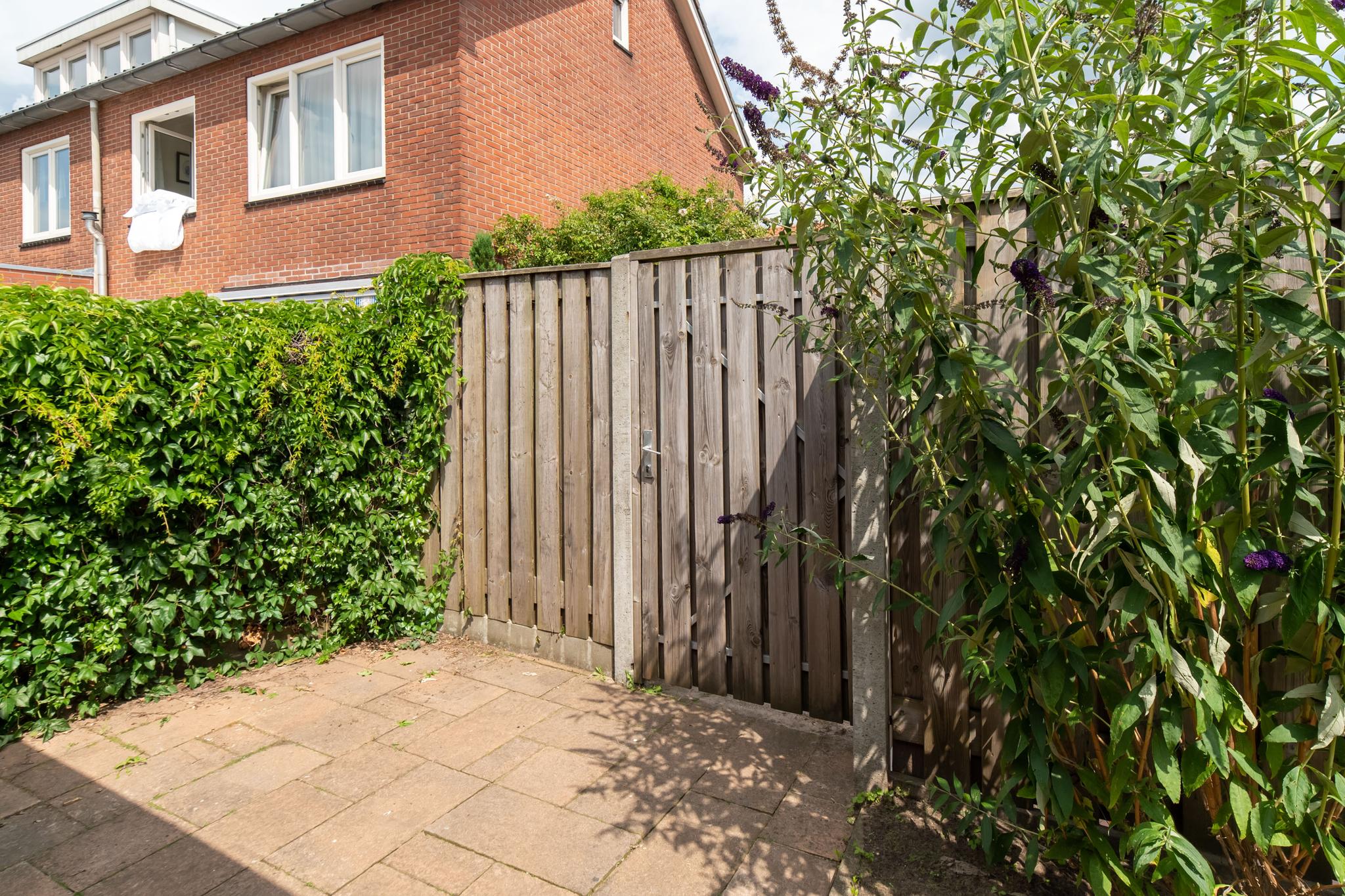 De tuin bevindt zich op het noordwesten en is middels een achterom te bereiken. Er is een fijne overkapping geplaatst tegen de achterzijde van de woning en met de berging achterin de tuin, heb je altijd plek voor je tuingereedschap of fietsen.