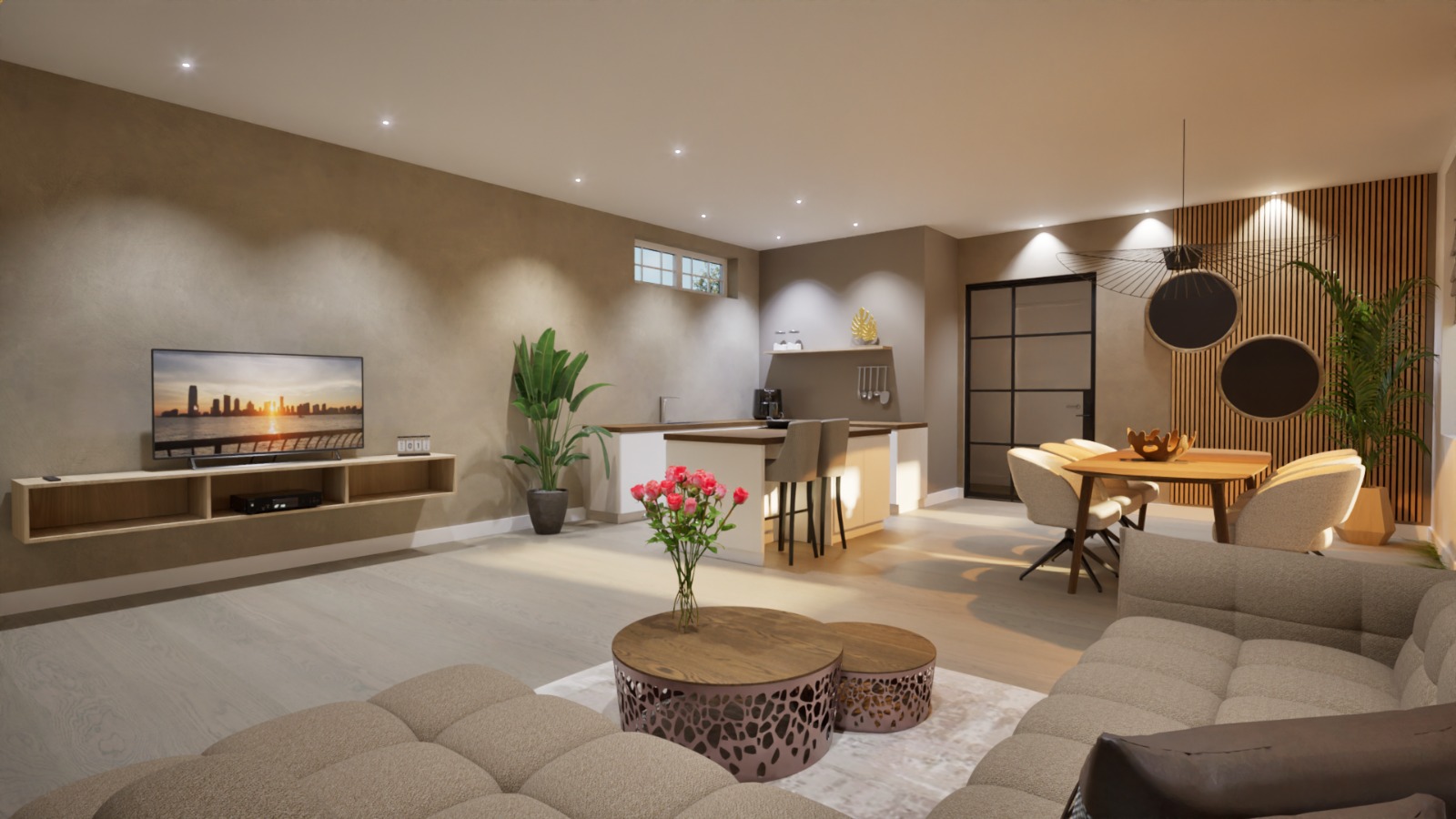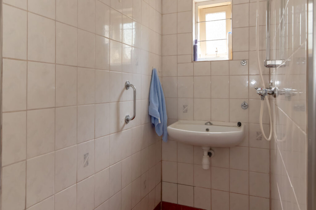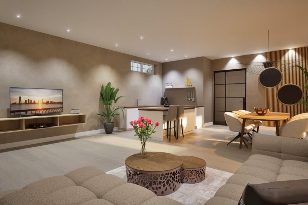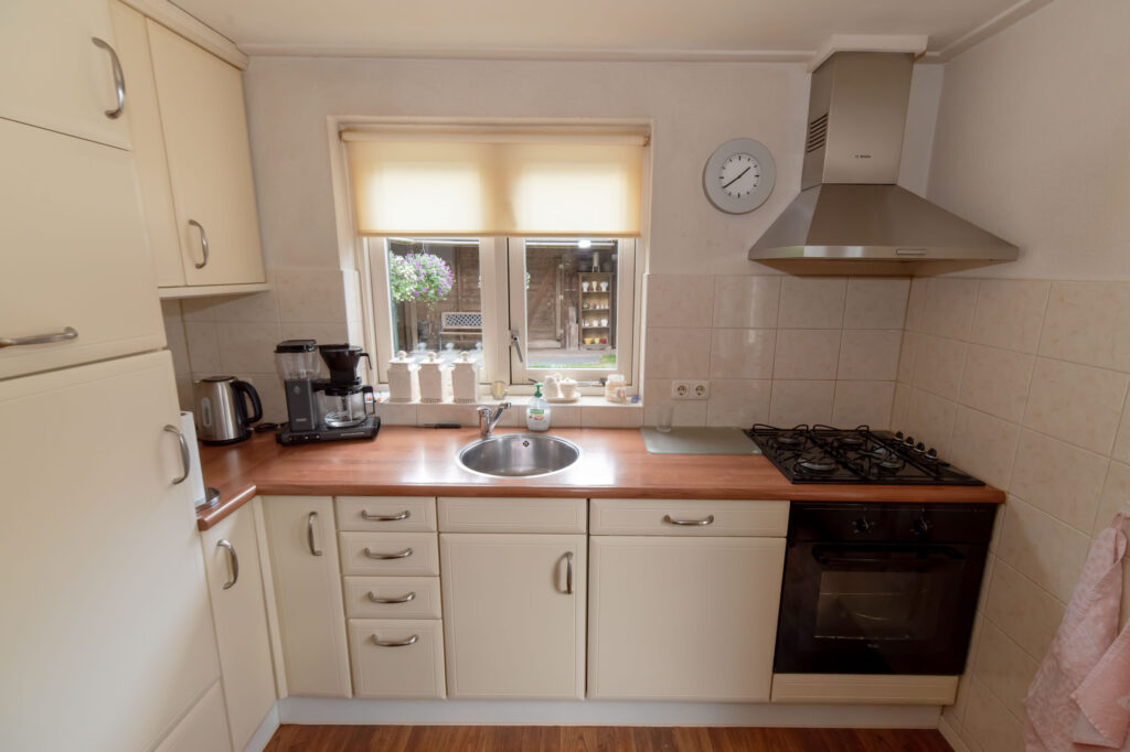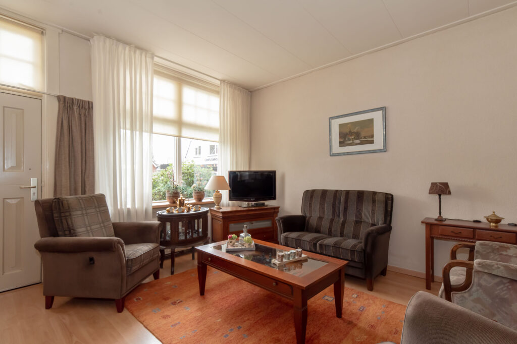 De woonkamer bevindt zich aan de voorzijde van de woning en is met twee toegangsdeuren gescheiden van de slaapkamer op de begane grond. De keuken is voorzien van een inbouwkeuken met apparatuur zoals een koelkast, vaatwasser, kookplaat en voldoende kastruimte. Vanuit de keuken krijg je toegang tot de tuin via dubbele deuren, en tot de badkamer. De badkamer is ingericht met een wastafel en een inloopdouche.