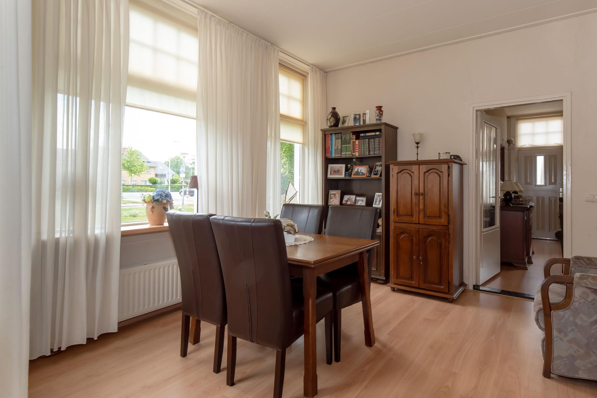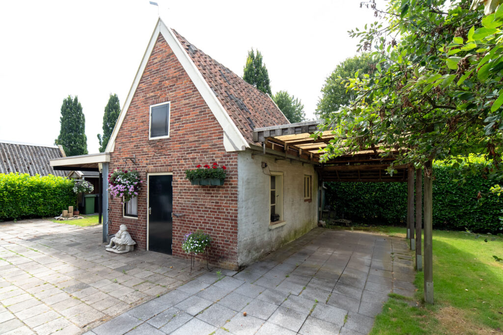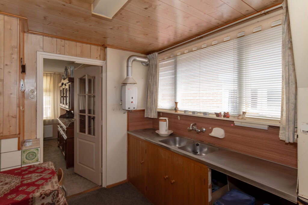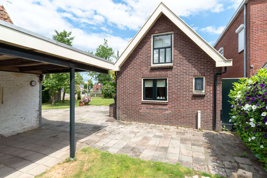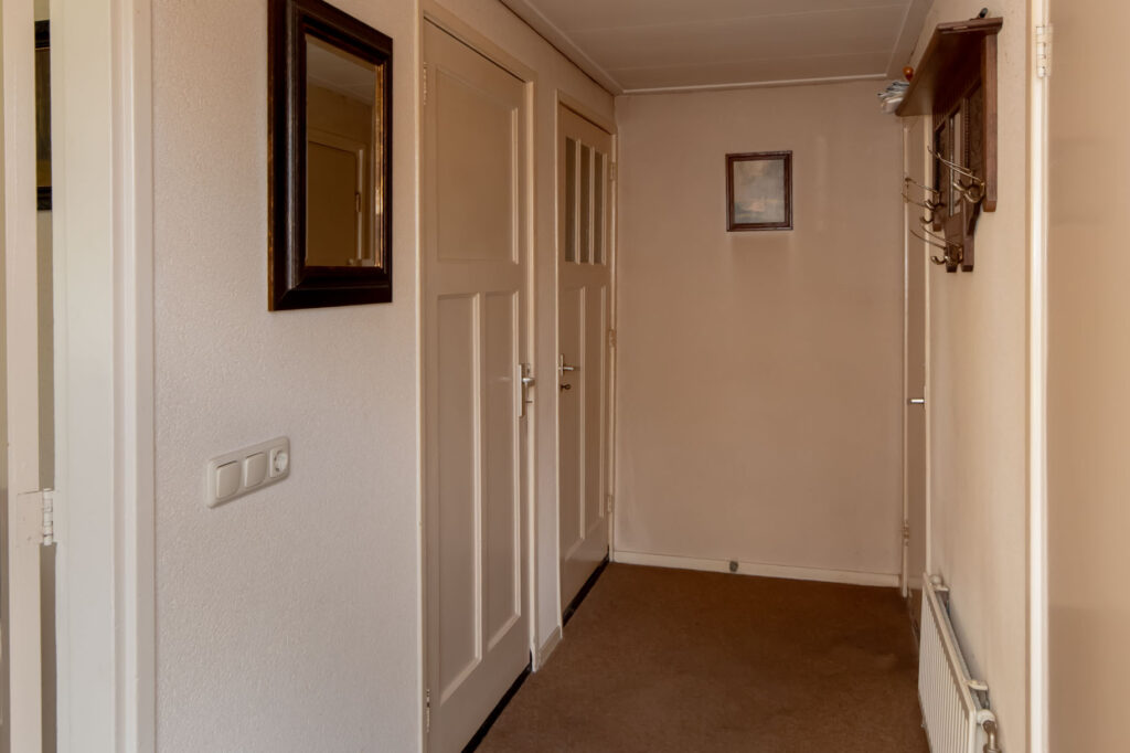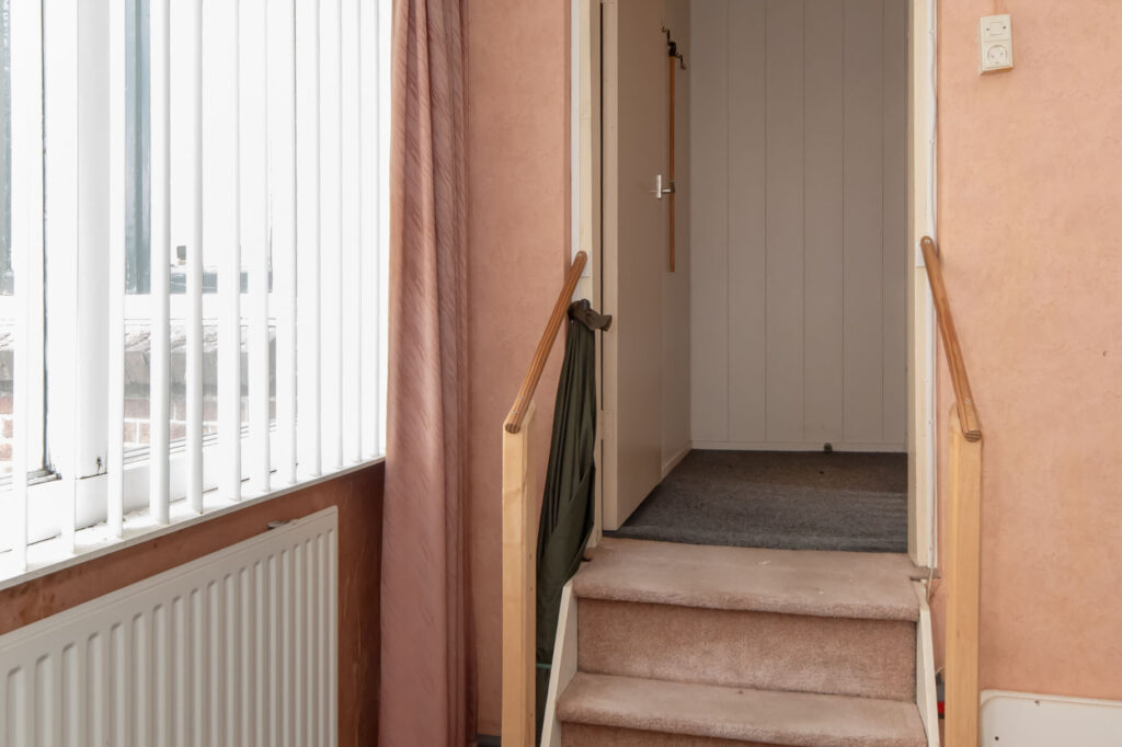 Je kunt je auto parkeren op je eigen oprit of onder de carport. De originele voordeur bevindt zich aan de voorzijde van de woning, maar via de zijdeur kom je in de hal terecht. Deze hal geeft toegang tot het toilet, de keuken, de kelder, de trap naar de eerste verdieping en de eetkamer. De eetkamer is weer verbonden met de woonkamer en de bijkeuken, die tevens in gebruik is als wasruimte.