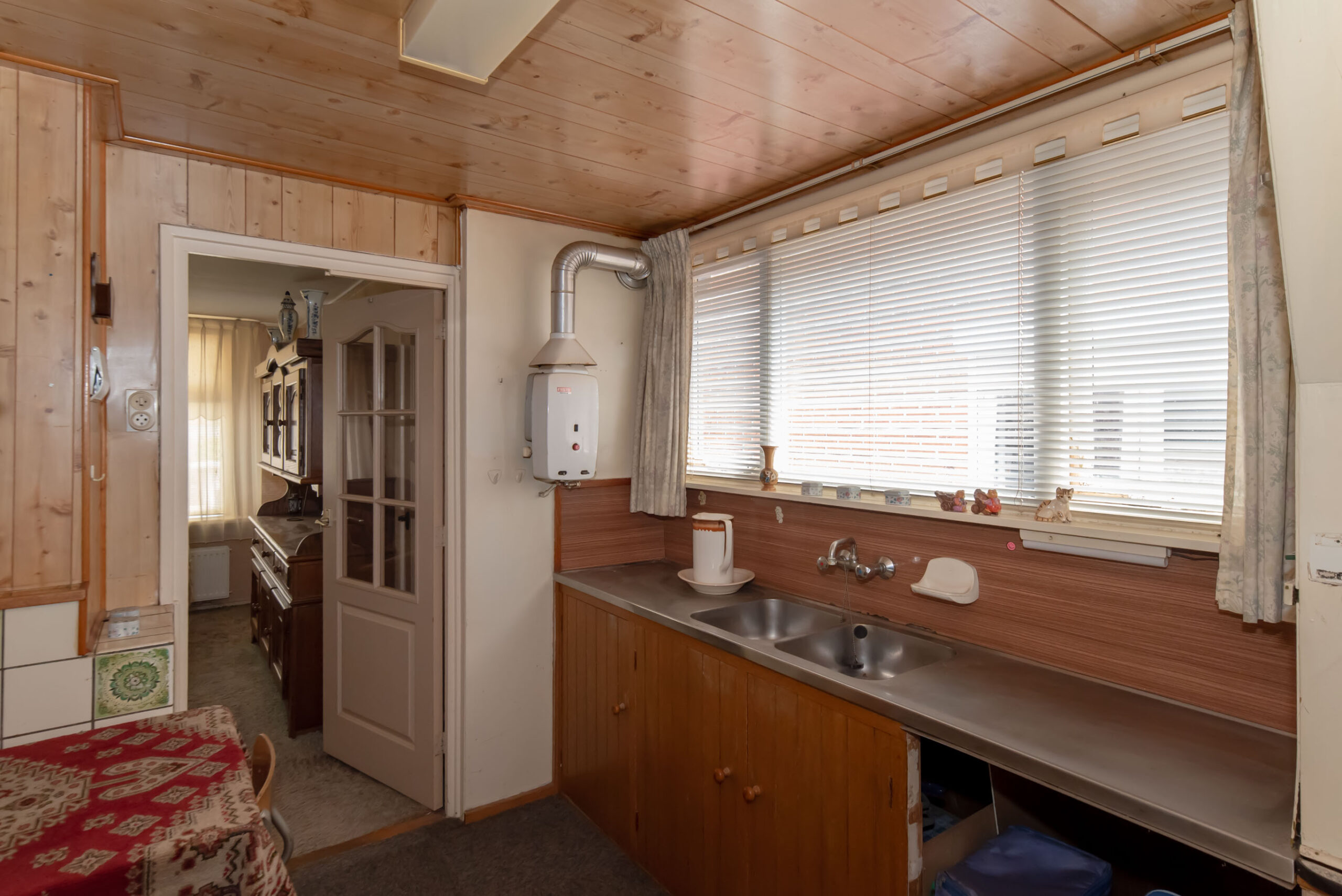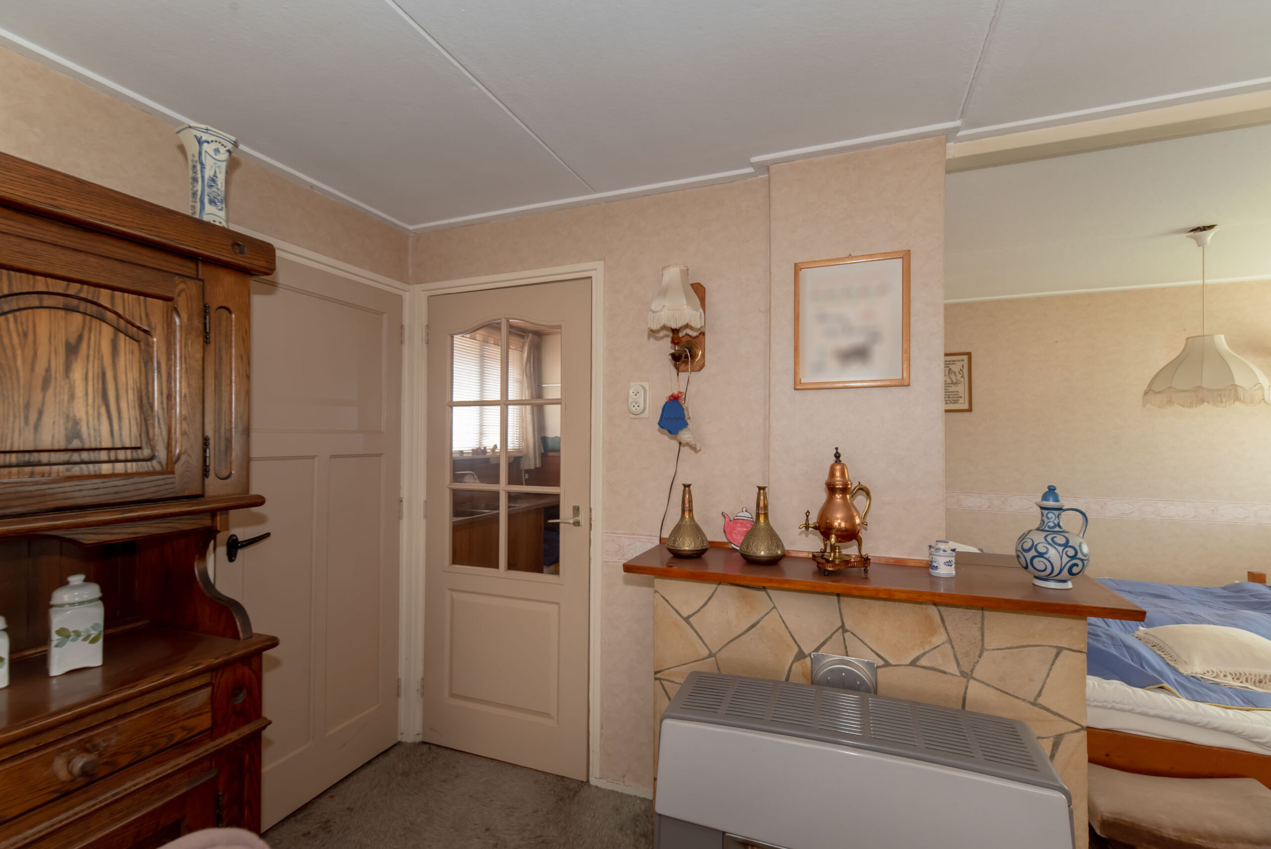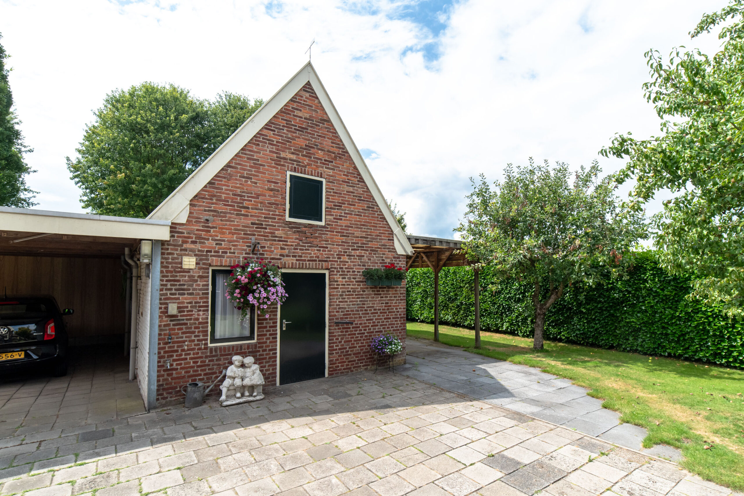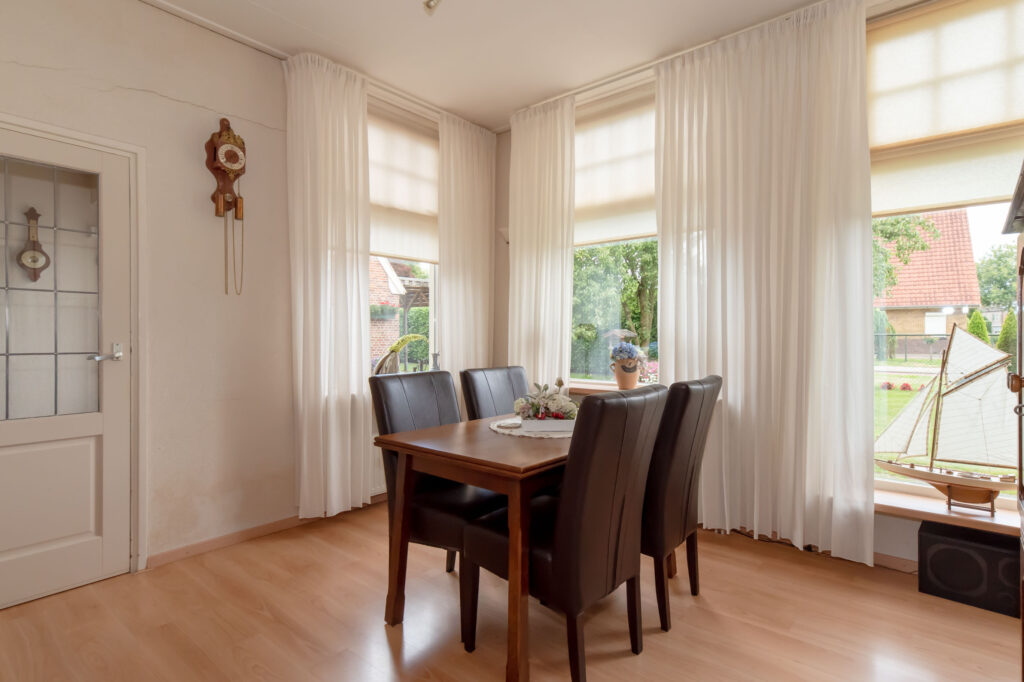Je kunt je auto parkeren op je eigen oprit of onder de carport. De originele voordeur bevindt zich aan de voorzijde van de woning, maar via de zijdeur kom je in de hal terecht. Deze hal geeft toegang tot het toilet, de keuken, de kelder, de trap naar de eerste verdieping en de eetkamer. De eetkamer is weer verbonden met de woonkamer en de bijkeuken, die tevens in gebruik is als wasruimte.