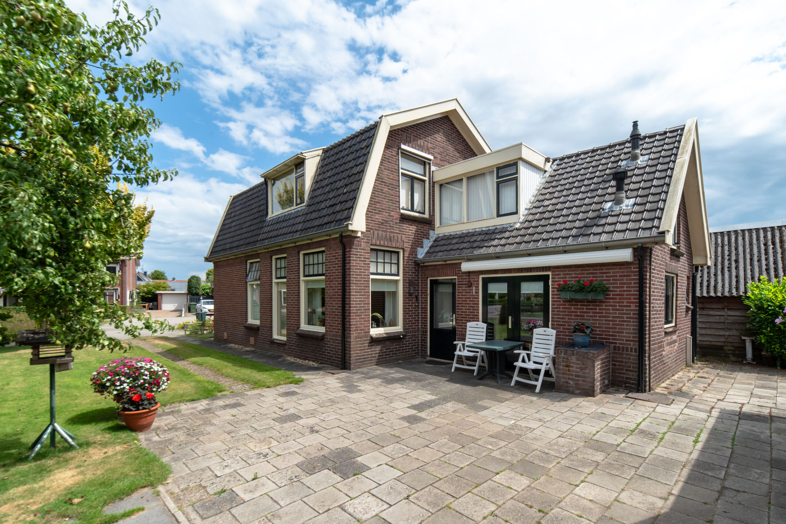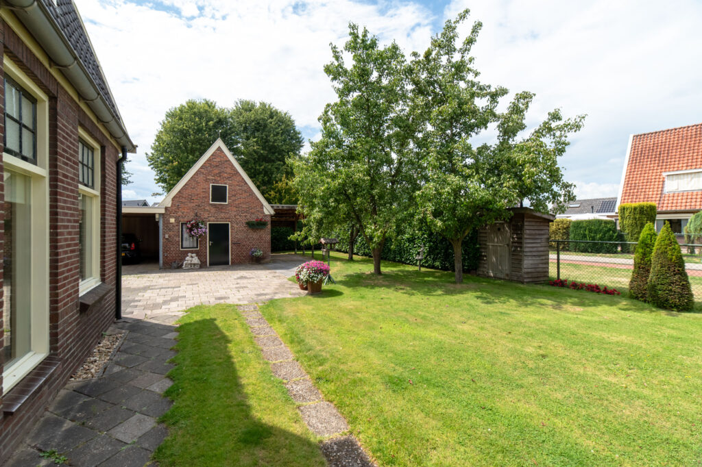 De tuin is fraai aangelegd met een betegeld terras, een mooie grasmat en bloeirijke beplanting.