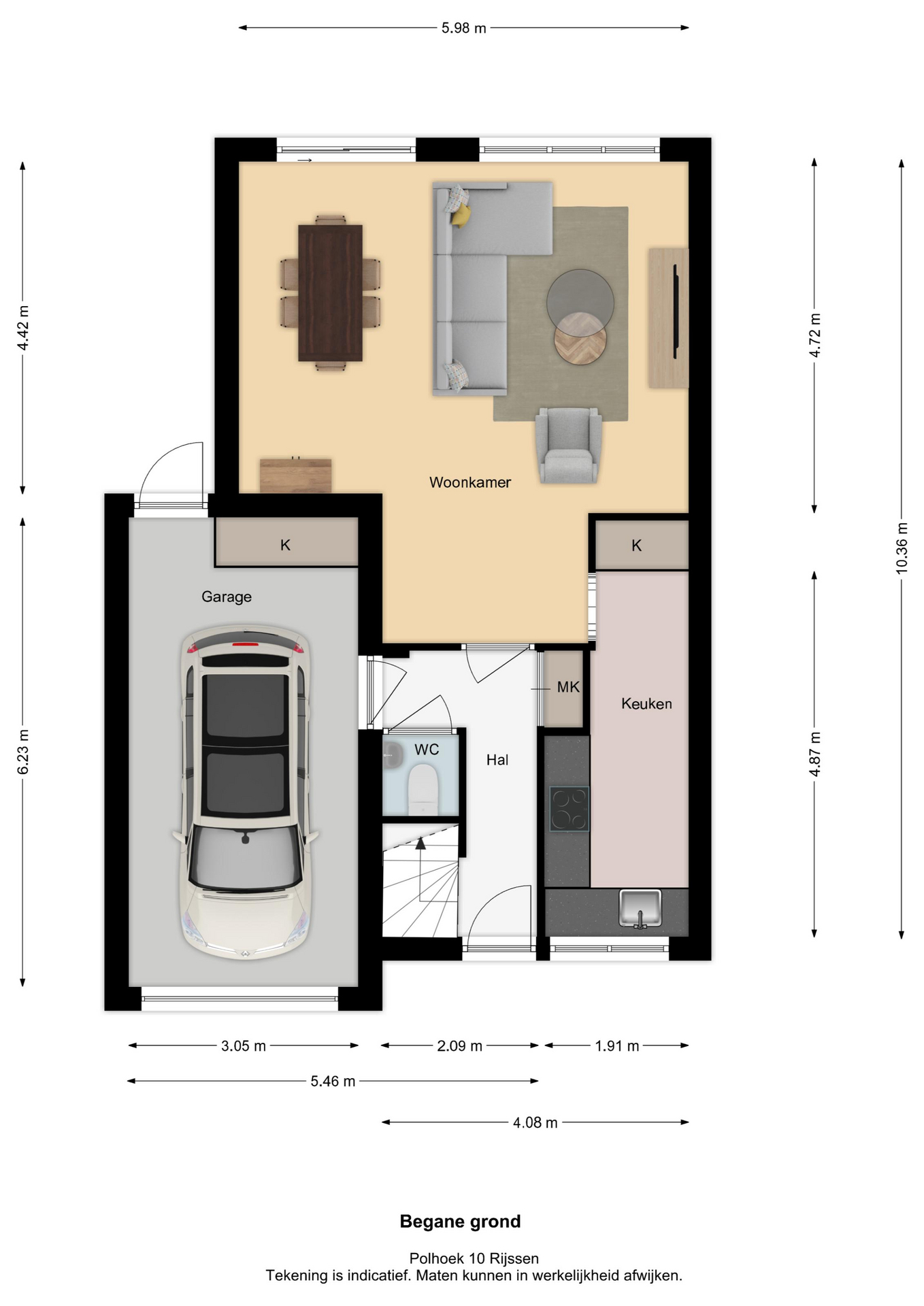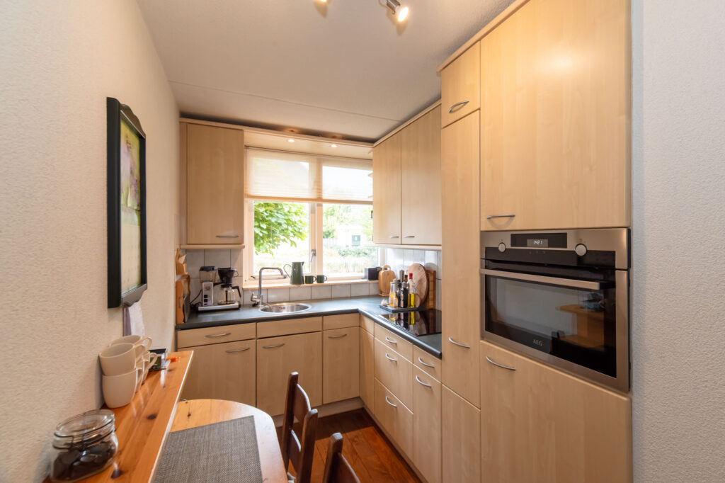 De auto kan je in de garage of op je oprit parkeren. Via de voordeur betreed je de hal van de woning, hier vind je het toilet, trap naar de eerste verdieping, deur naar de garage en naar de woonkamer. De woonkamer is ruim opgesteld en gelegen aan aan de tuinzijde van de woning. Deze woonkamer biedt mogelijkheden voor een royale zit- en eethoek en is voorzien van een schuifpui naar de zonnige tuin. Via de woonkamer is de open keuken te bereiken, deze is voorzien van een inbouwkeuken met apparatuur zoals een vaatwasser, koelkast, combi-oven en een inductiekookplaat. De tuin is onderhoudsvriendelijk en verzorgd aangelegd en voorzien van een fietsenberging.