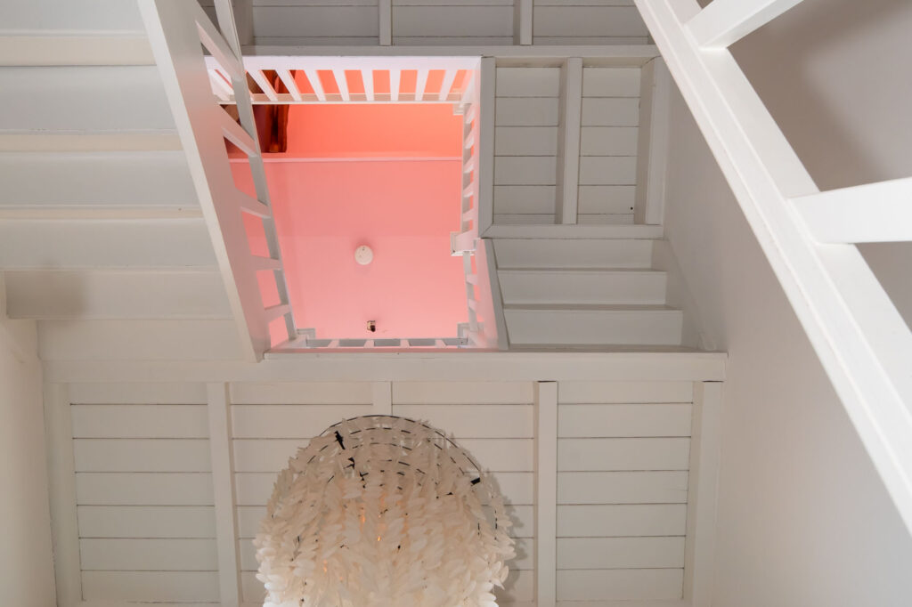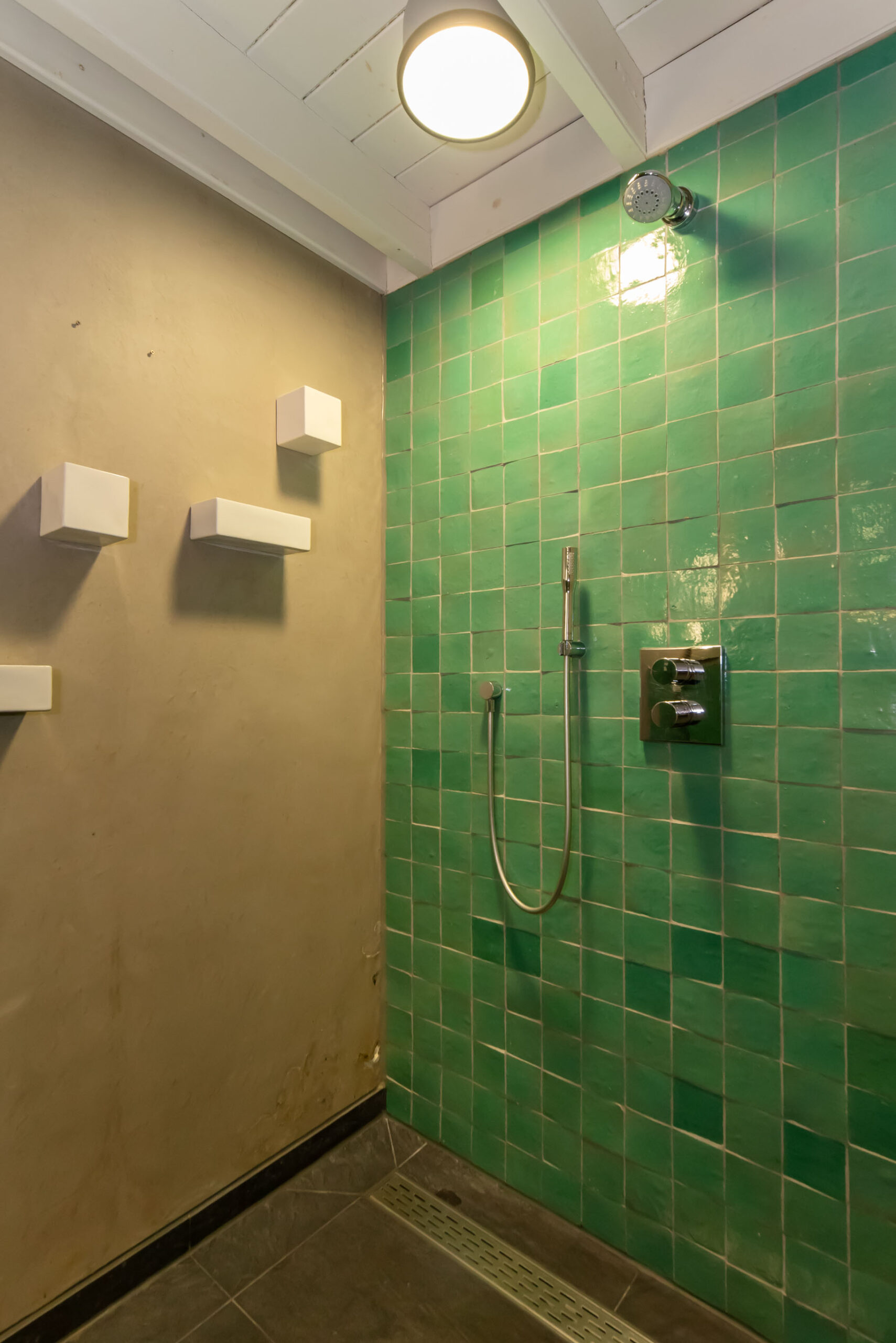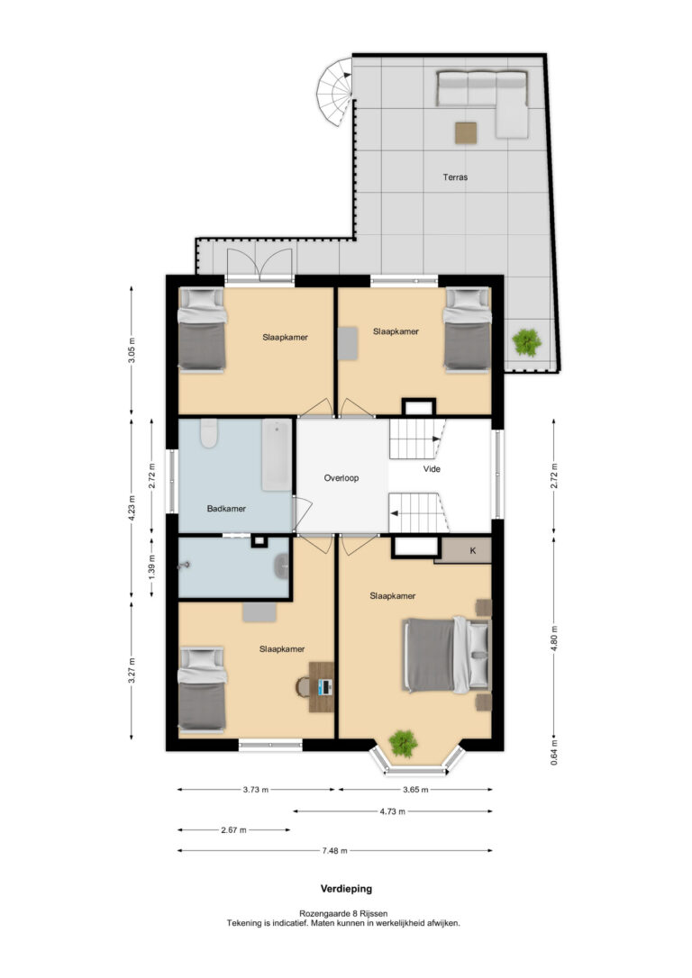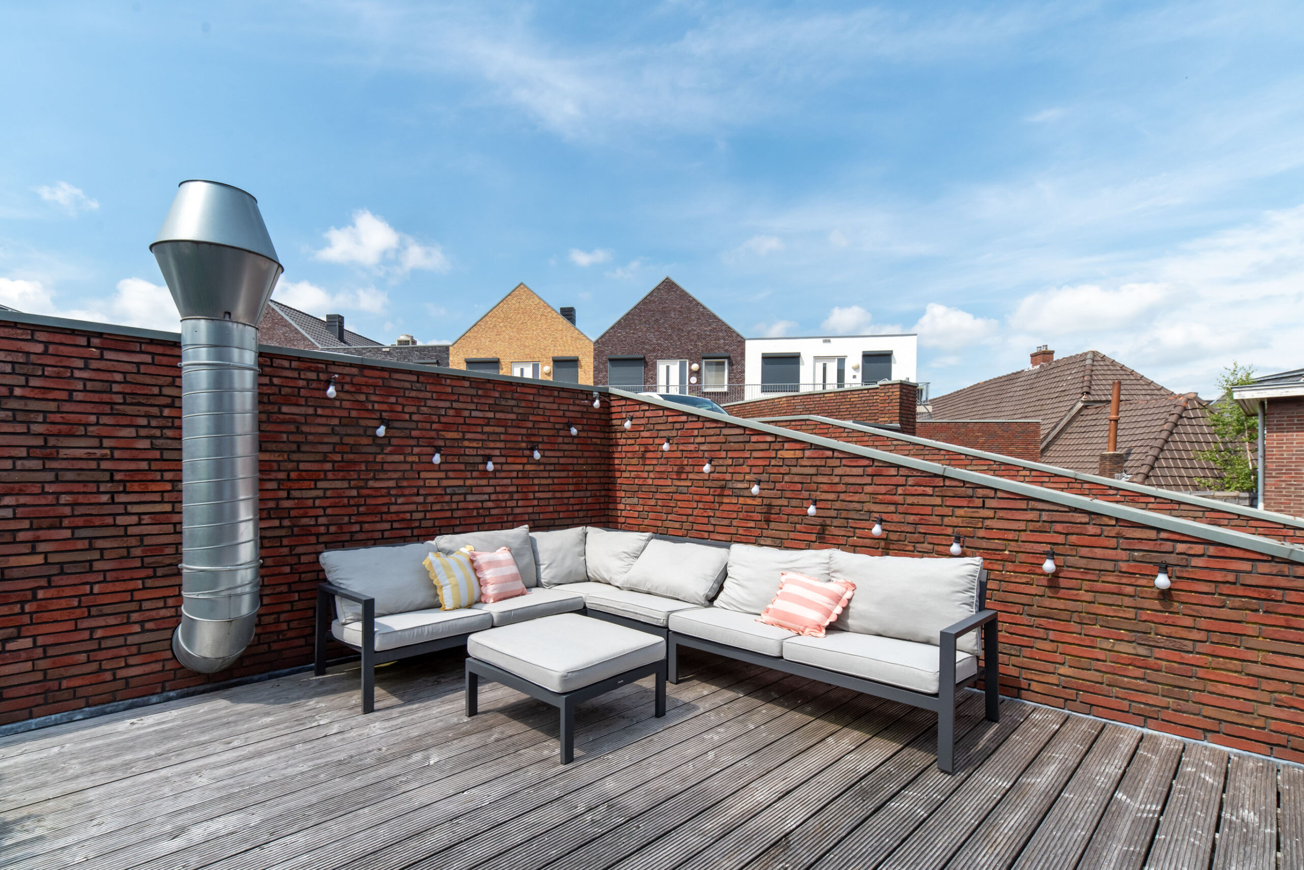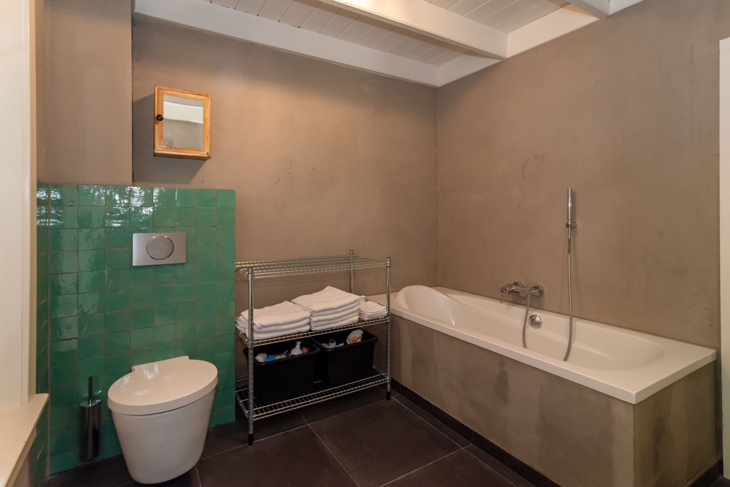 Op de eerste verdieping bevinden zich vier slaapkamers, waaronder één met openslaande deuren naar het dakterras. Daarnaast vind je hier de badkamer, uitgevoerd met ligbad, inloopdouche, toilet en wastafel. Vanaf de overloop is de vaste trap naar de tweede verdieping bereikbaar.