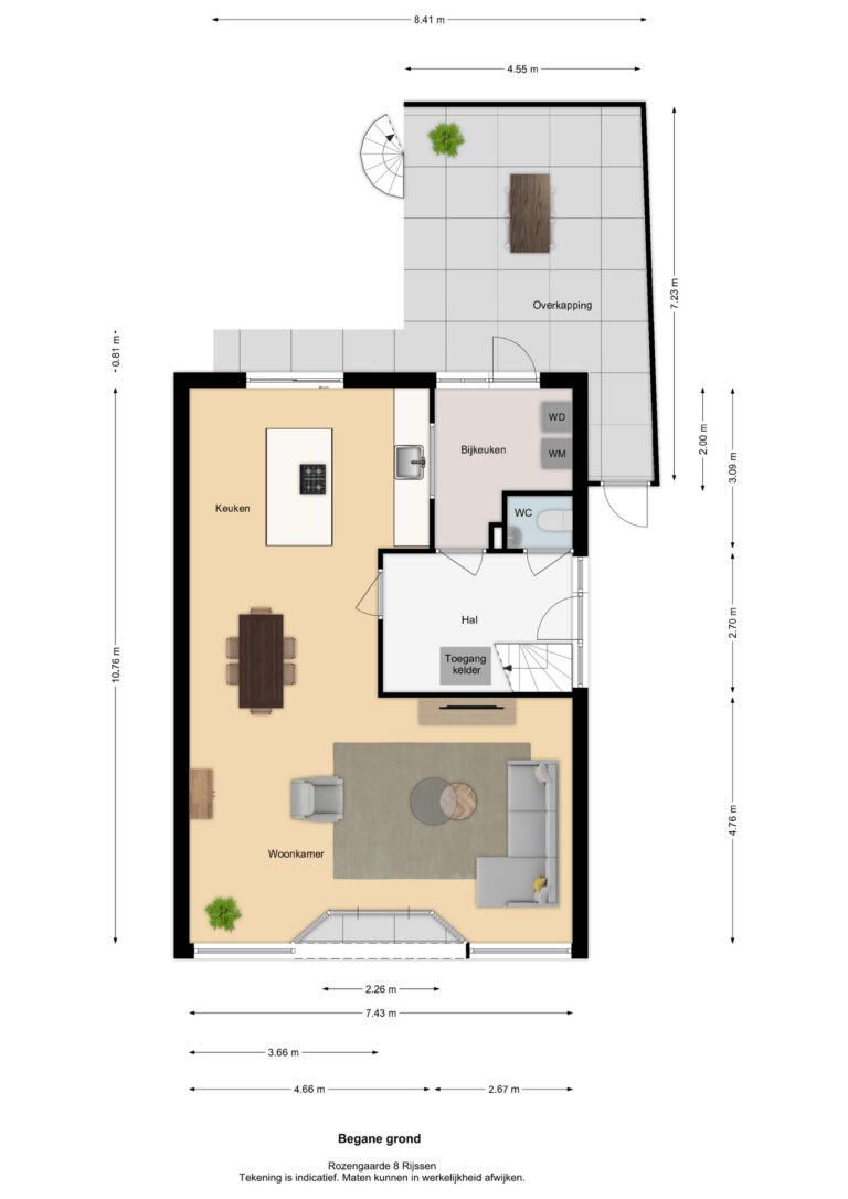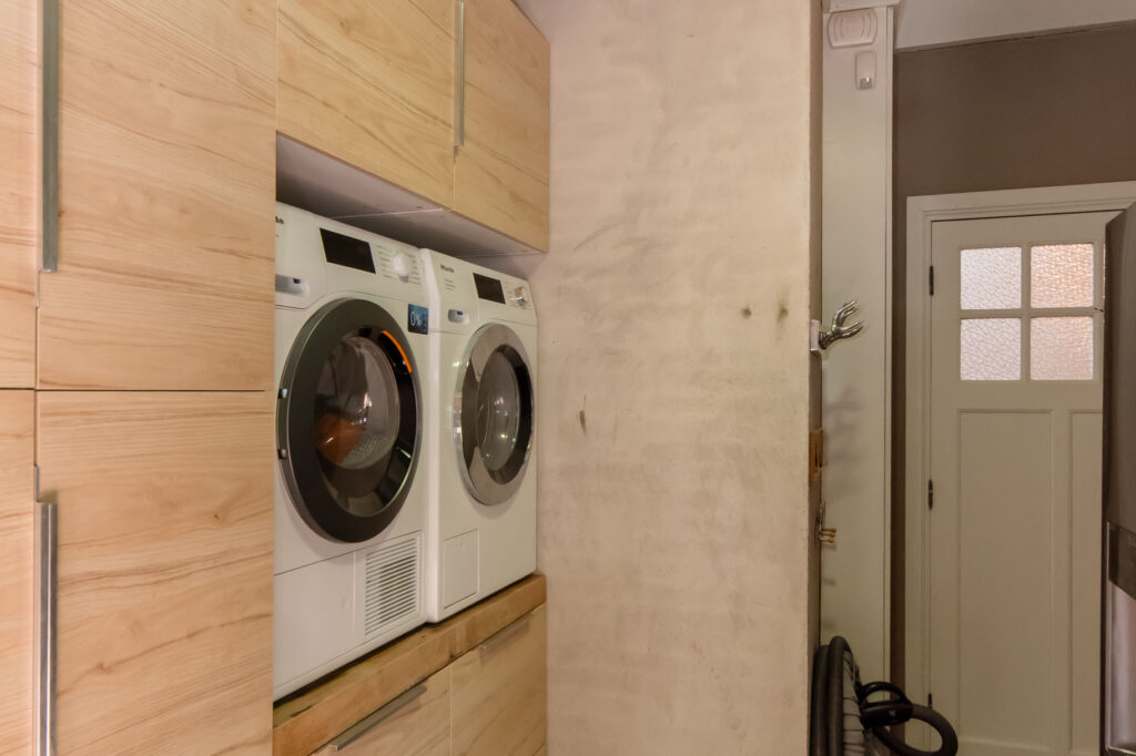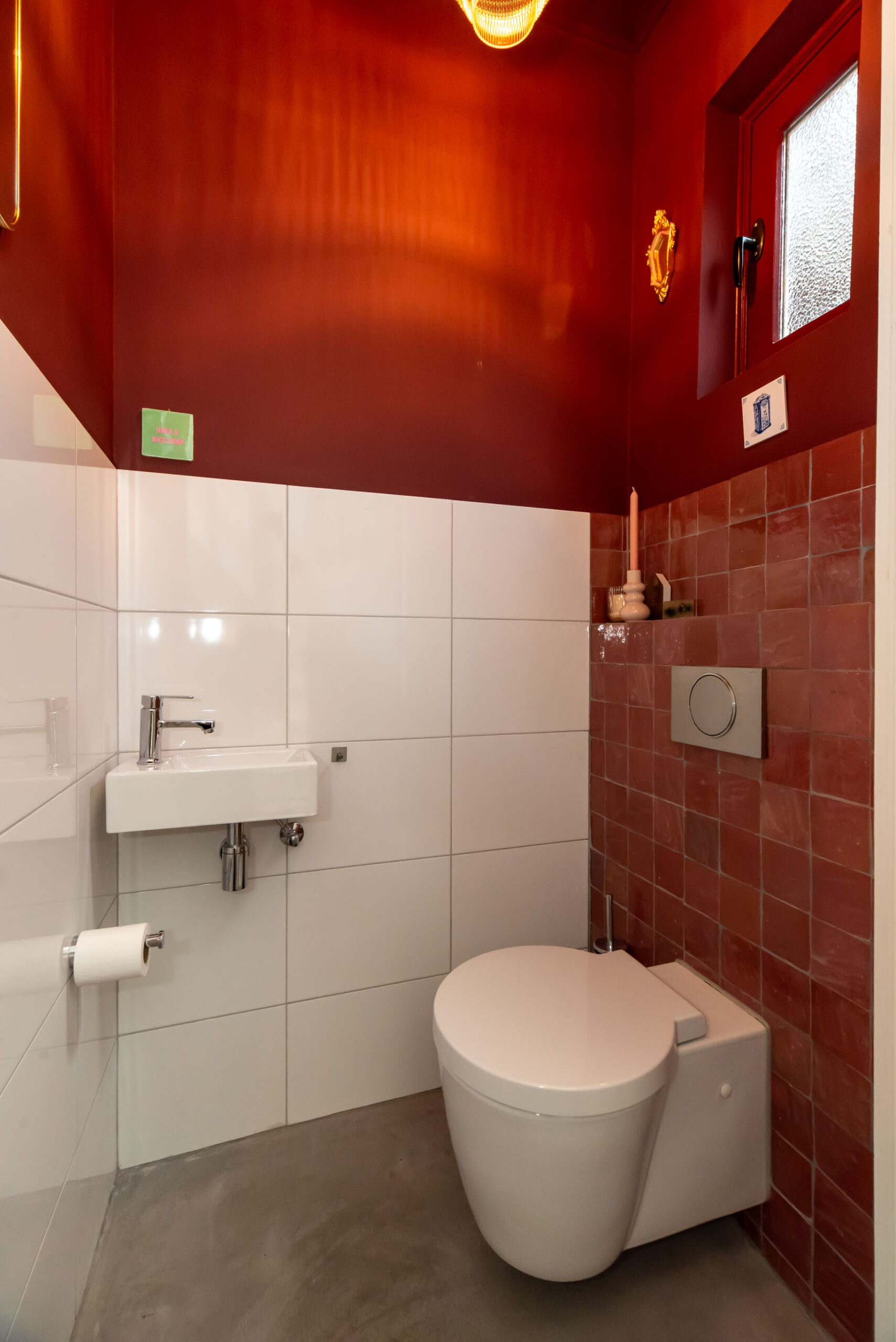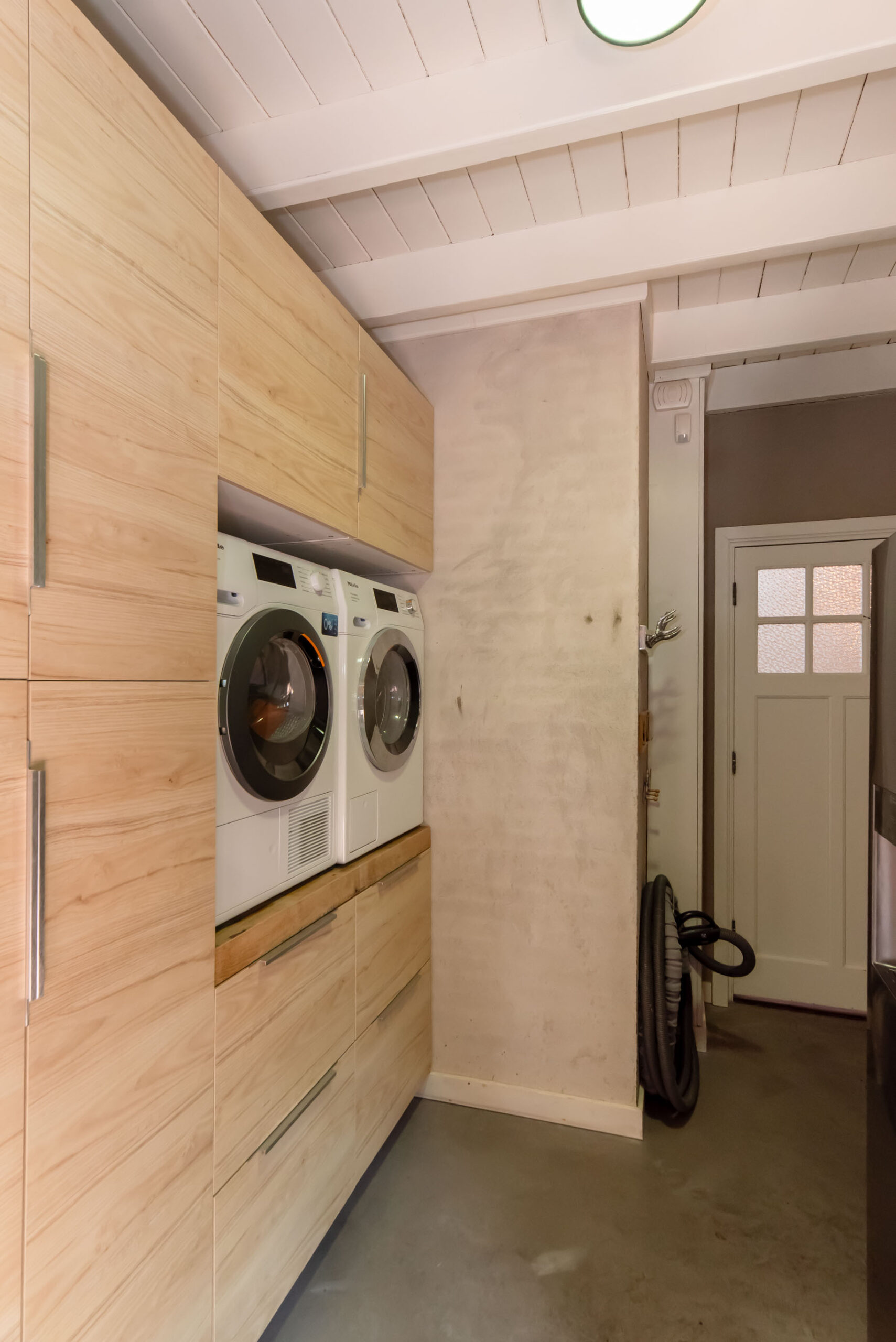 Aan de zijkant van de woning stap je via de voordeur binnen in de royale hal. Hier vind je het toilet, de bijkeuken, de kelder en de trap naar de eerste verdieping. De bijkeuken doet ook dienst als wasruimte en biedt directe toegang tot de achtertuin met overkapping.