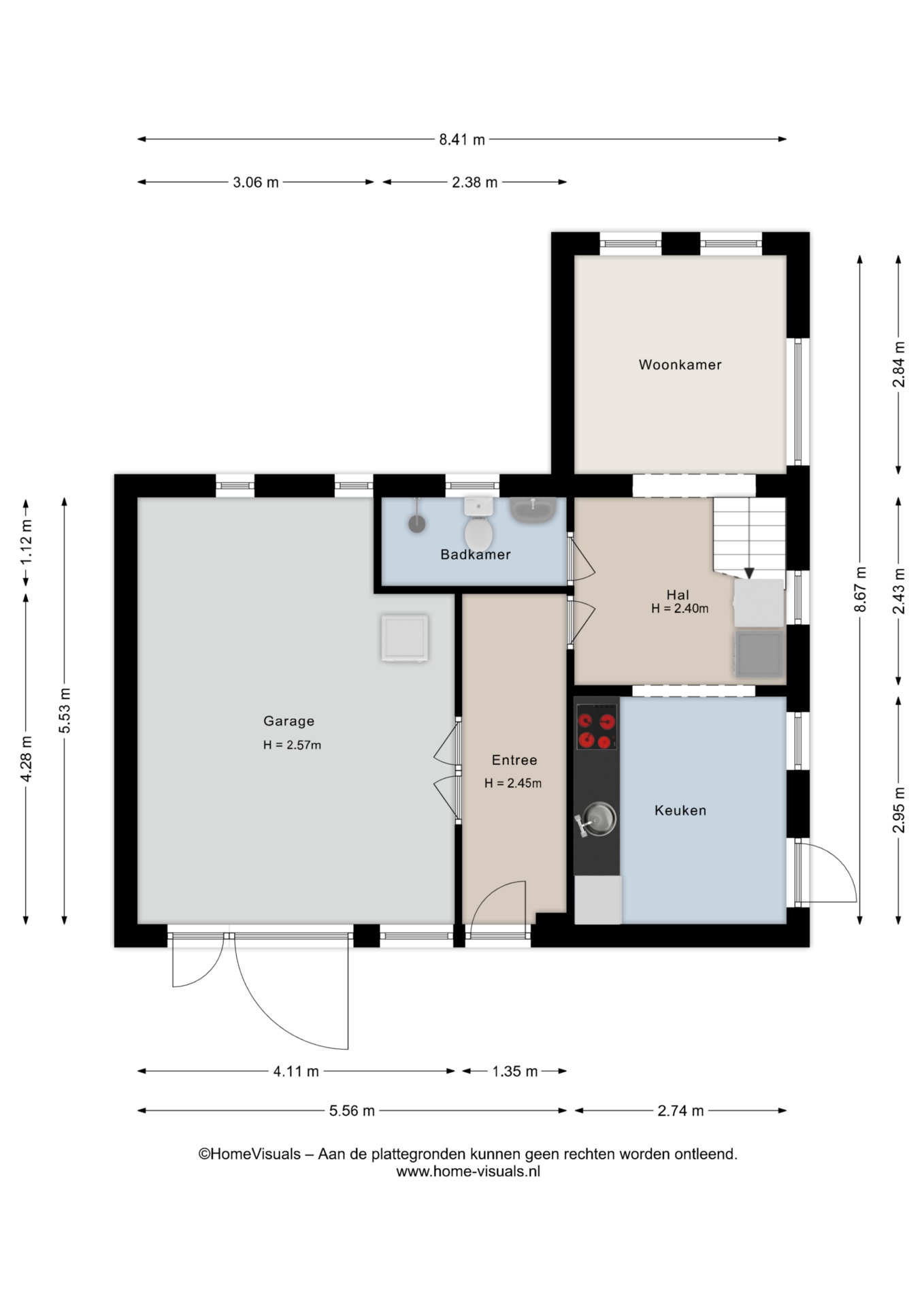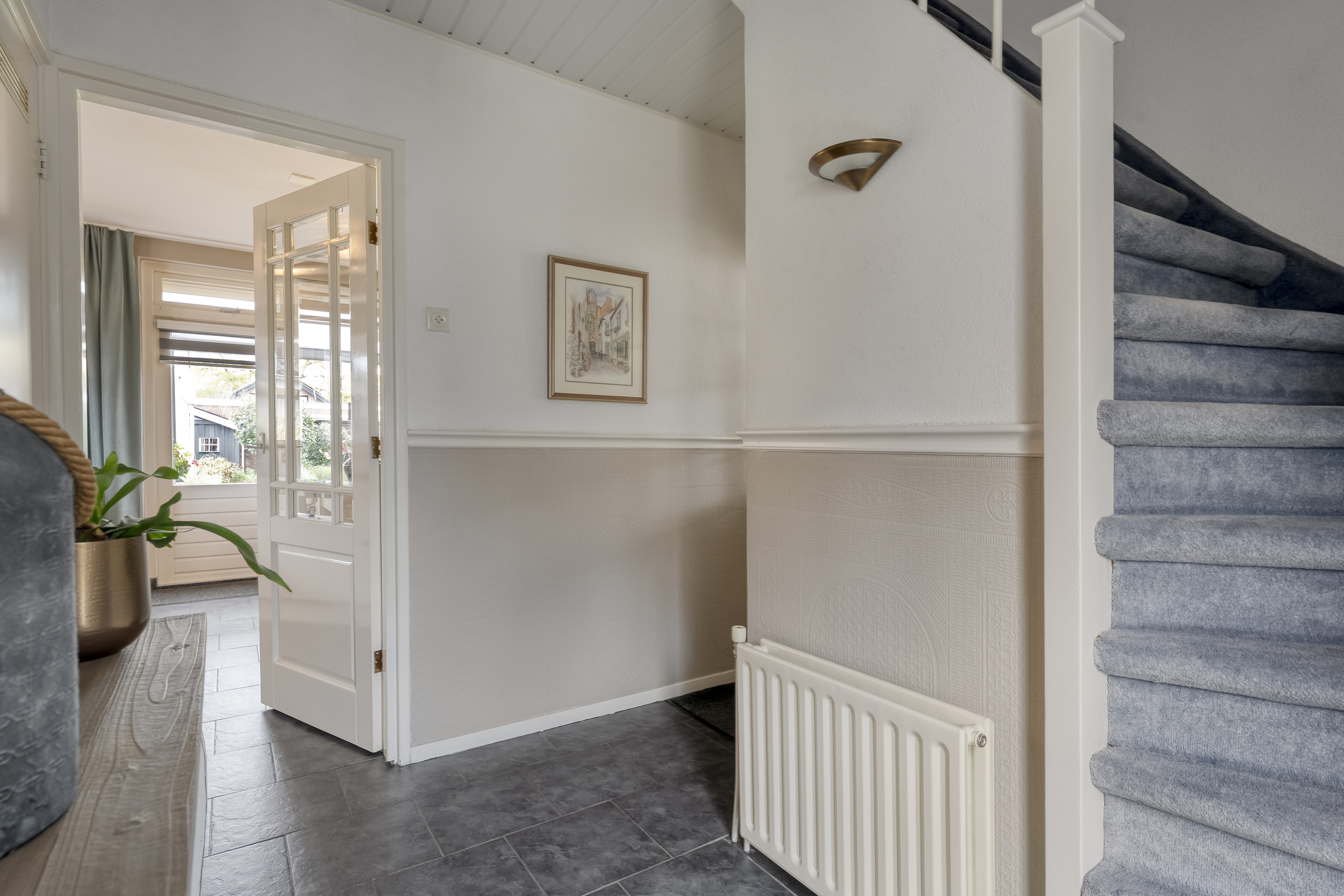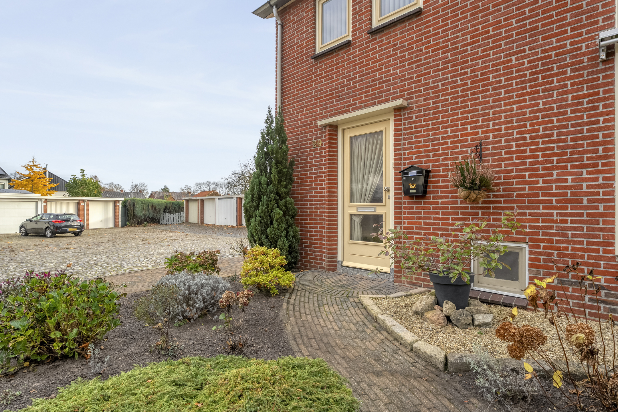 Je parkeert de auto op de eigen oprit of in de garage. Via de fraai aangelegde voortuin bereik je de voordeur en stap je binnen in de hal. Hier vind je de deuren naar de woonkamer, keuken, kelder, berging/CV-ruimte, het toilet en de trap naar de eerste verdieping.