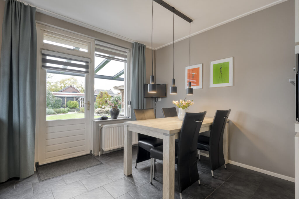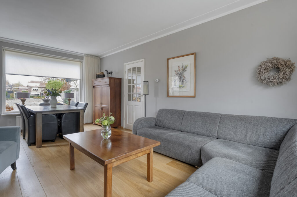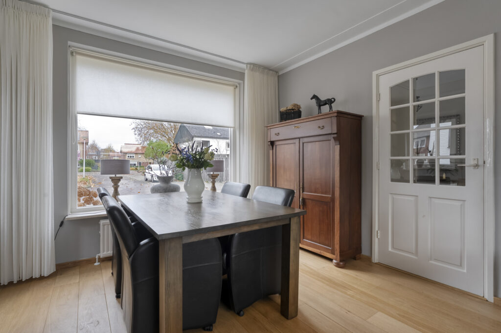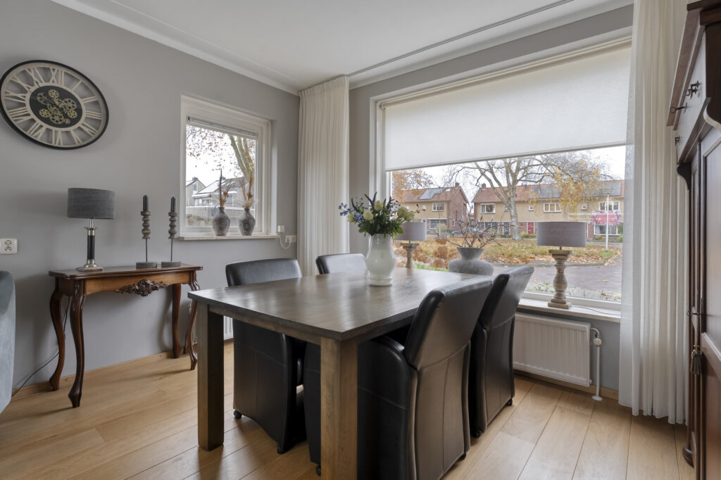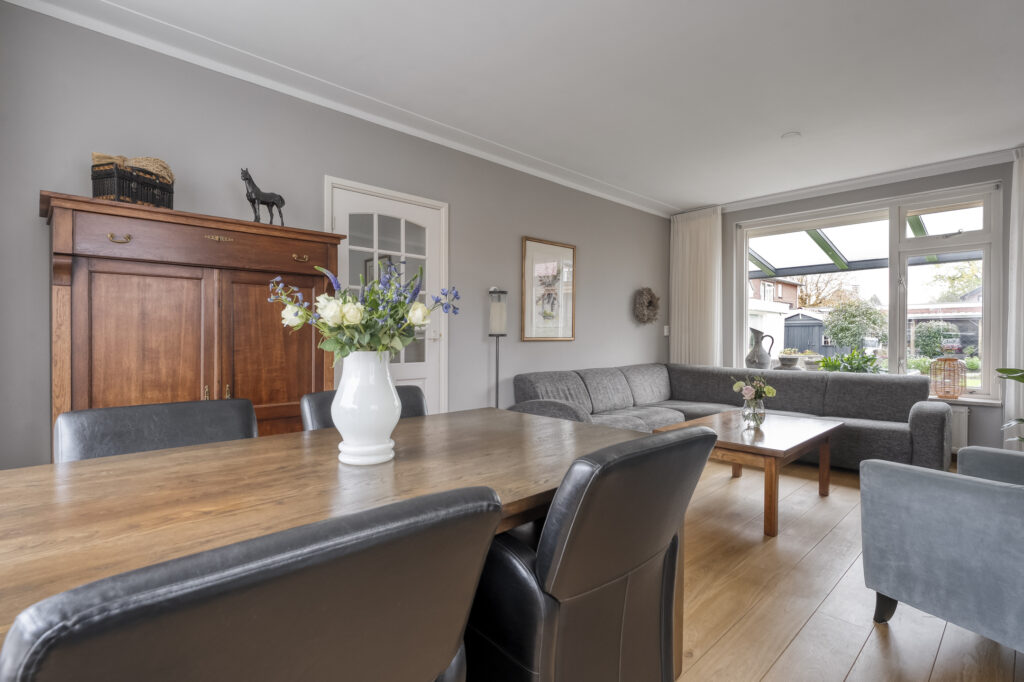In de woonkamer valt meteen het vele daglicht op dankzij de grote raampartijen. Er is meer dan genoeg ruimte voor een eettafel geschikt voor het hele gezin.