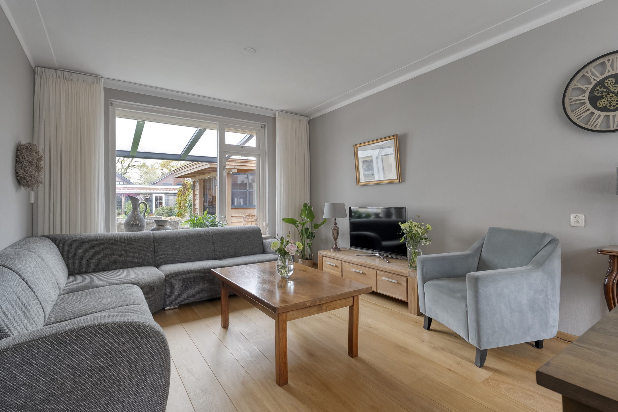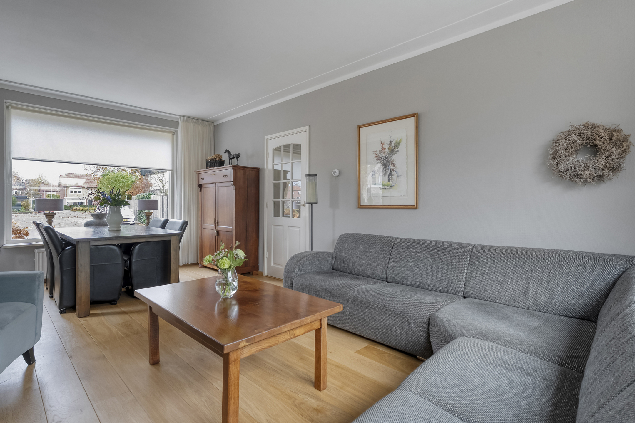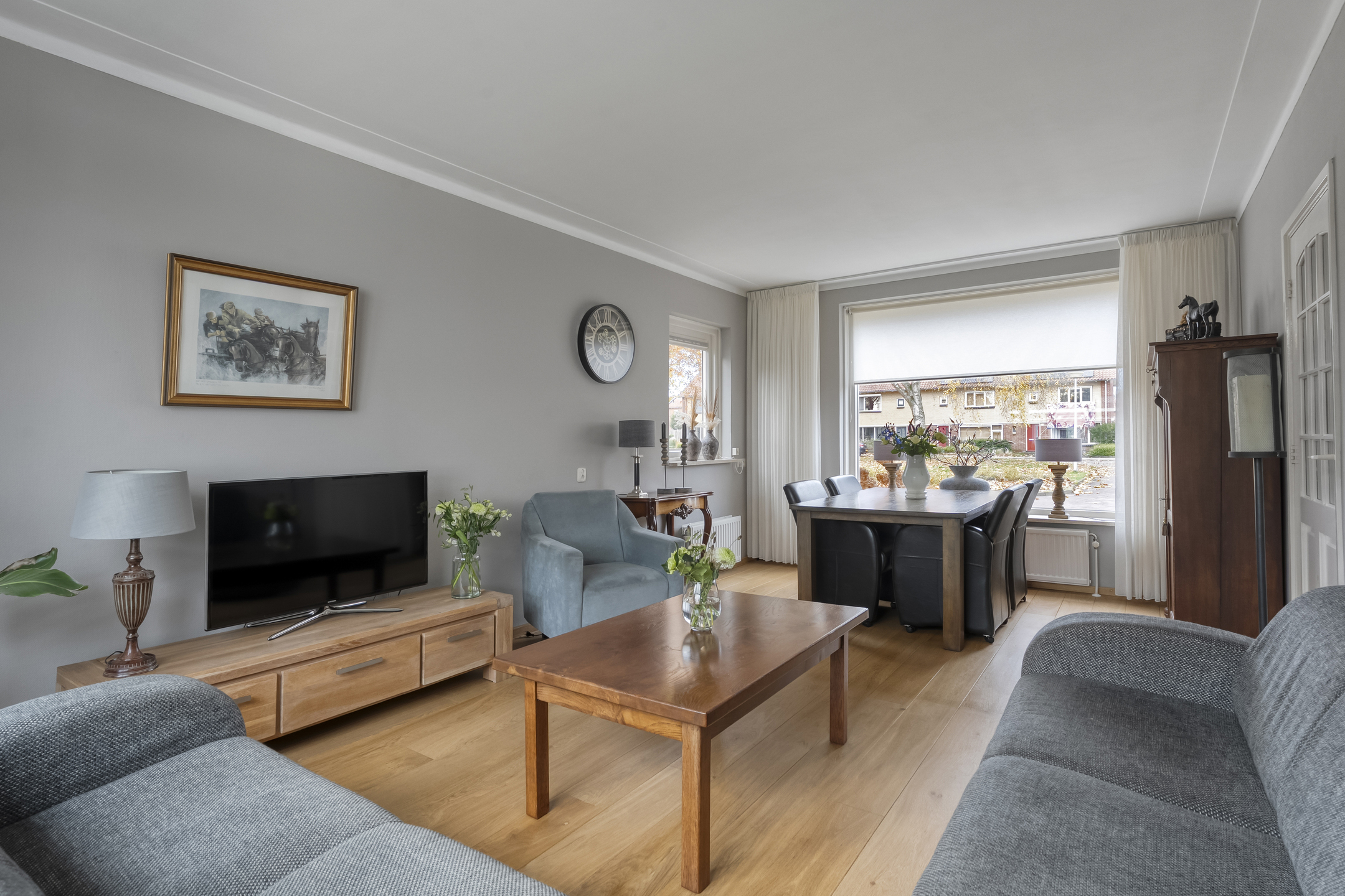 In de woonkamer valt meteen het vele daglicht op dankzij de grote raampartijen. Er is meer dan genoeg ruimte voor een eettafel geschikt voor het hele gezin.