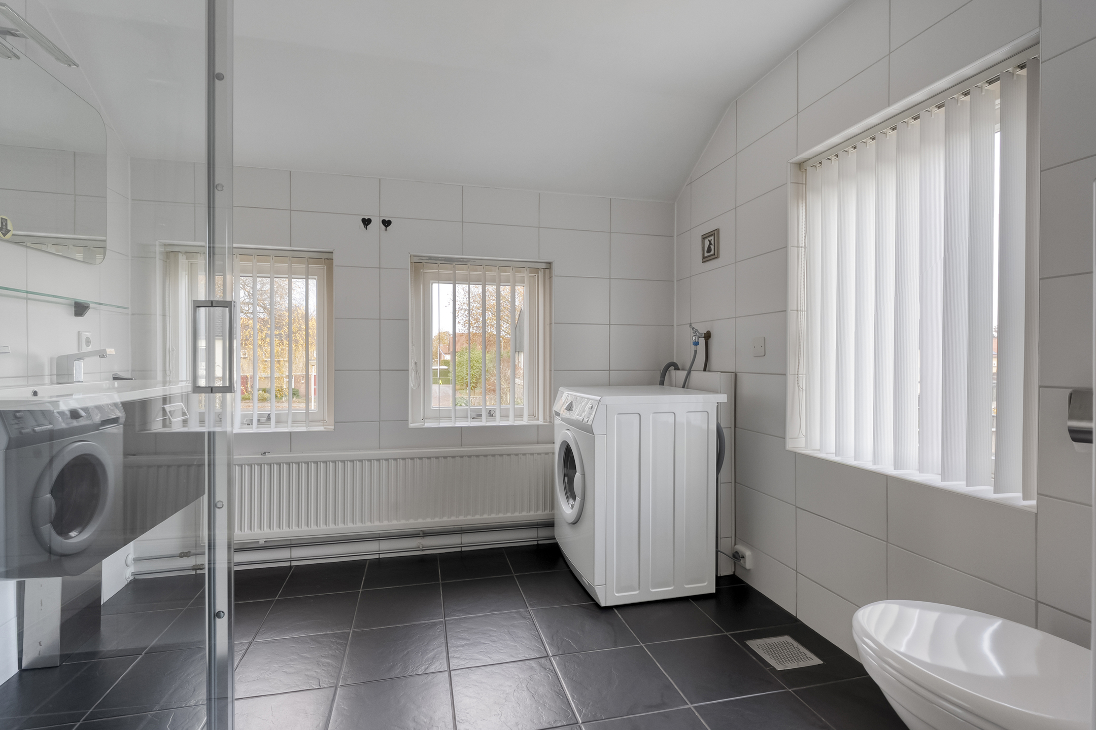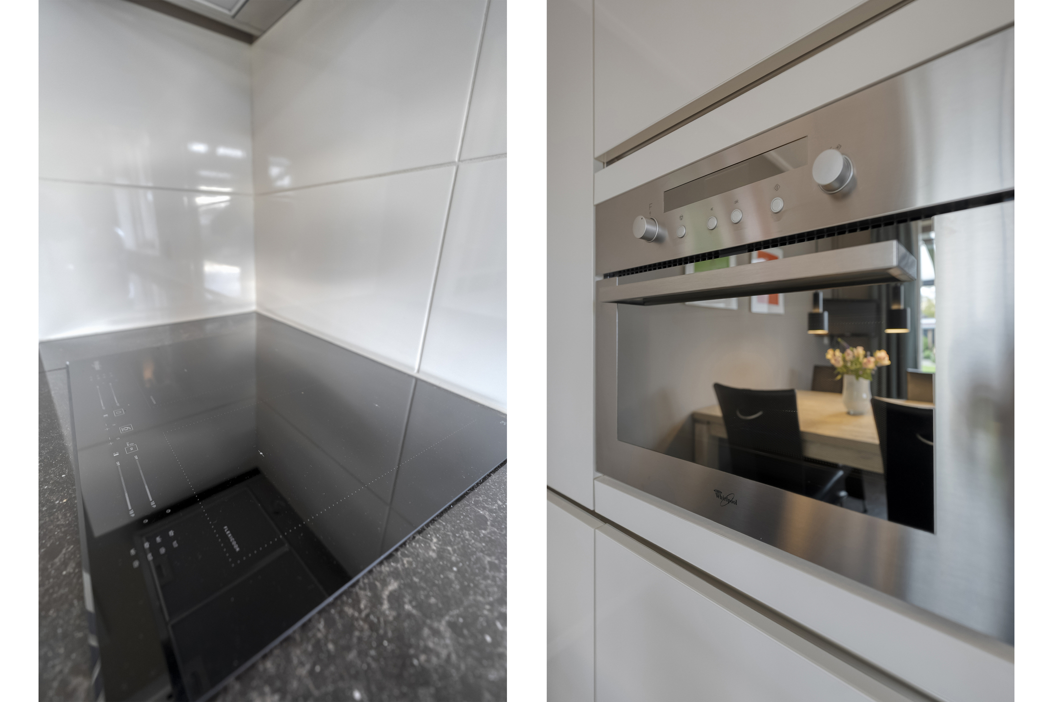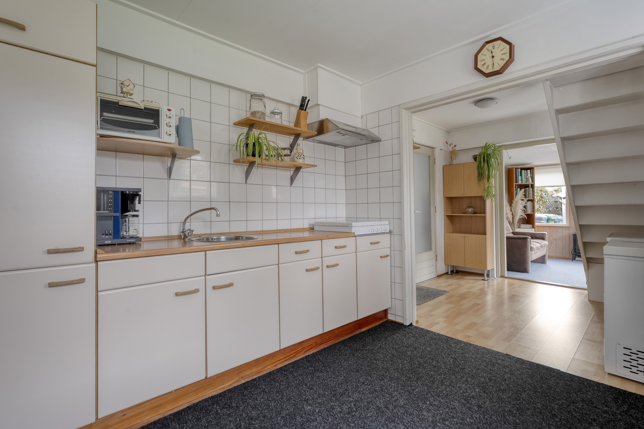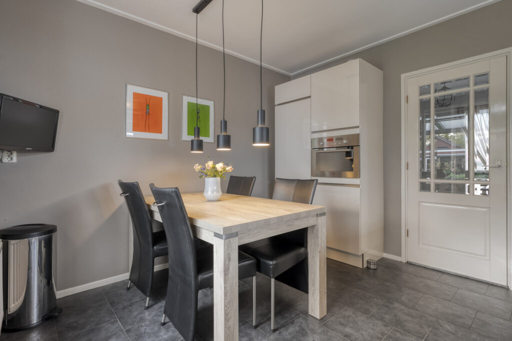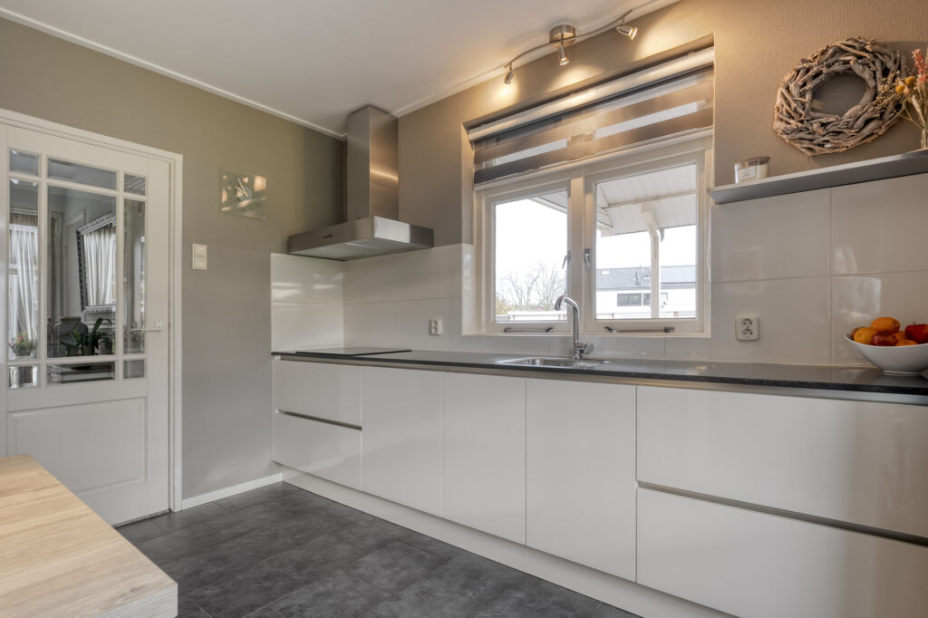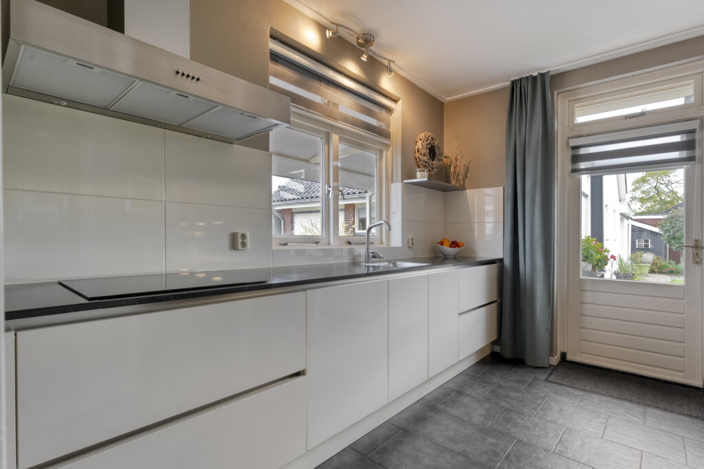 De keuken is uitgerust met een inbouwkeuken voorzien van een inductiekookplaat, combi-oven, vaatwasser, koelkast en voldoende kastruimte. Vanuit de keuken loop je zo de zonnige tuin in.