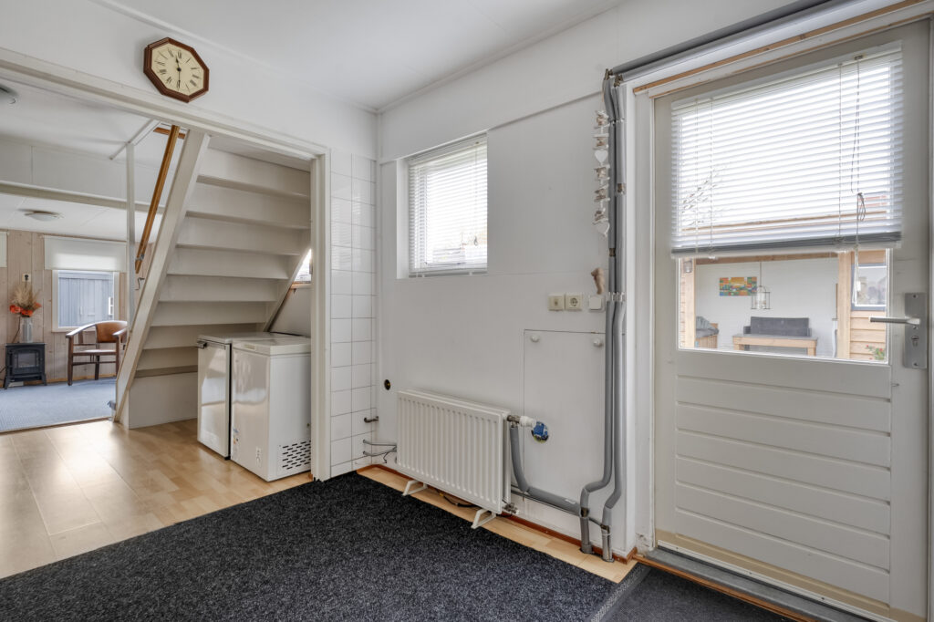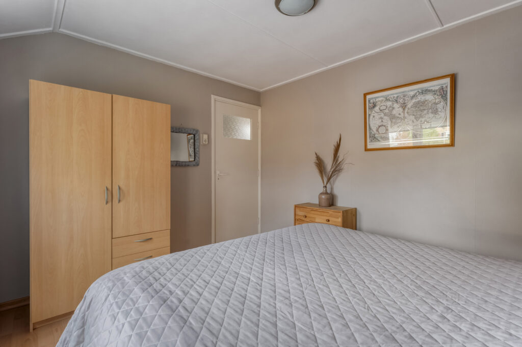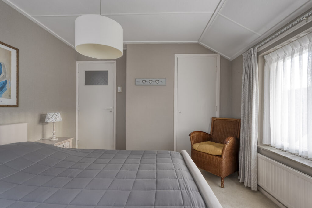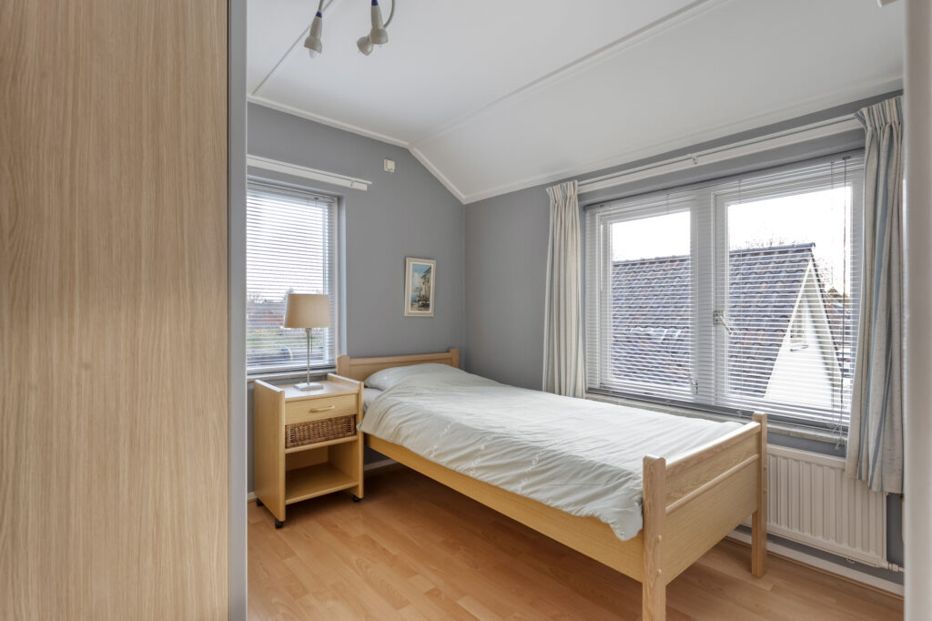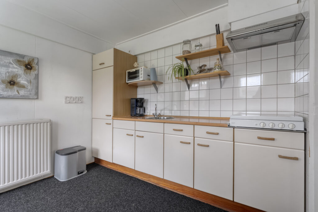 Het bijgebouw valt hier natuurlijk direct op. Op de begane grond vind je een woonkamer, keuken en badkamer. De keuken is voorzien van inbouwapparatuur zoals een gaskookplaat, koelkast en ruime kastruimte. De badkamer beschikt over een toilet, wastafel en douche. Via de hal ga je met de trap naar de eerste verdieping, waar zich nóg een slaapkamer bevindt.