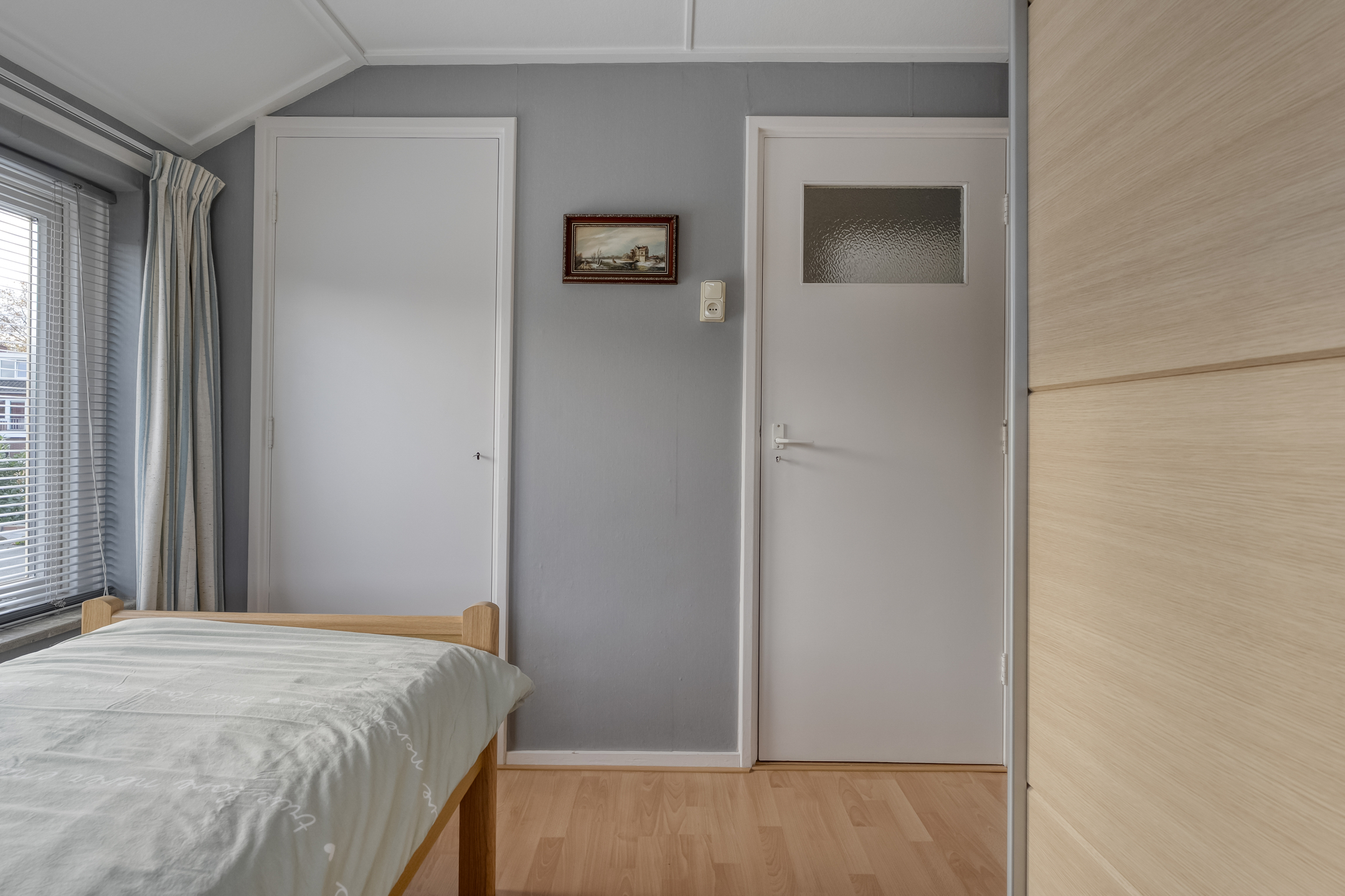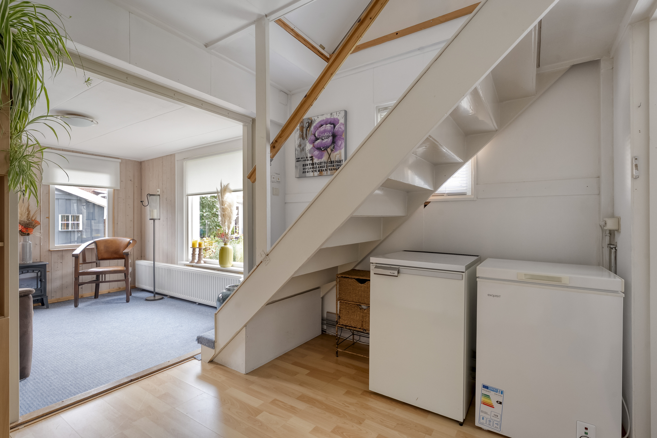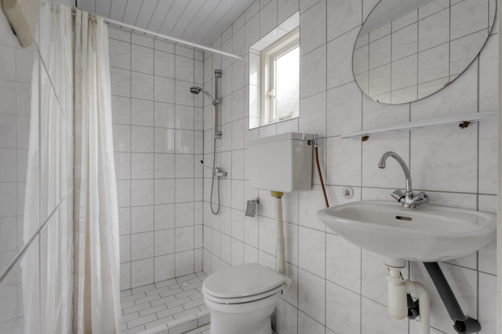 Het bijgebouw valt hier natuurlijk direct op. Op de begane grond vind je een woonkamer, keuken en badkamer. De keuken is voorzien van inbouwapparatuur zoals een gaskookplaat, koelkast en ruime kastruimte. De badkamer beschikt over een toilet, wastafel en douche. Via de hal ga je met de trap naar de eerste verdieping, waar zich nóg een slaapkamer bevindt.