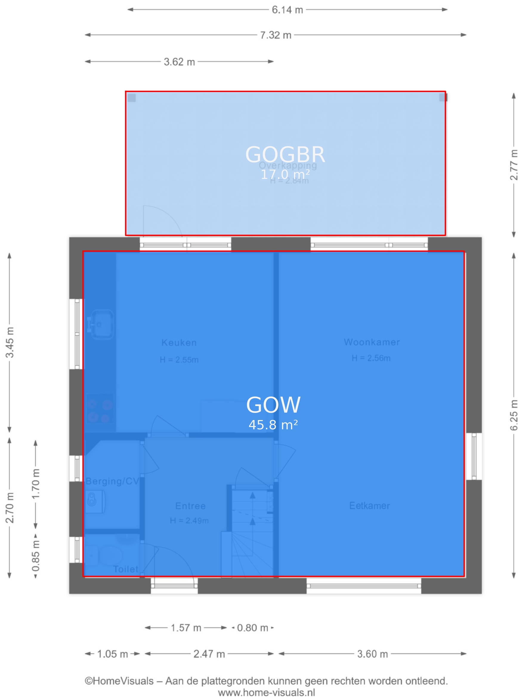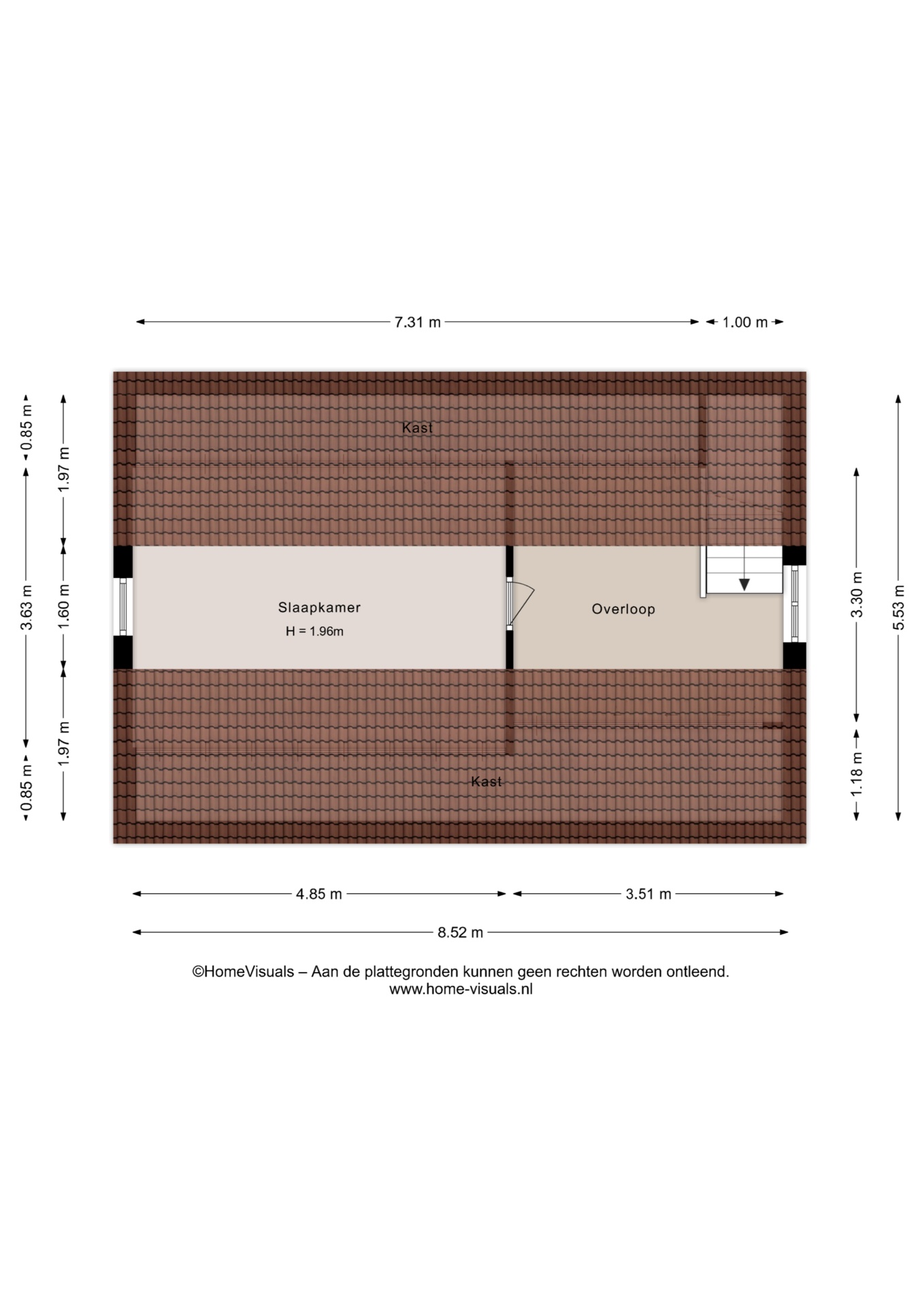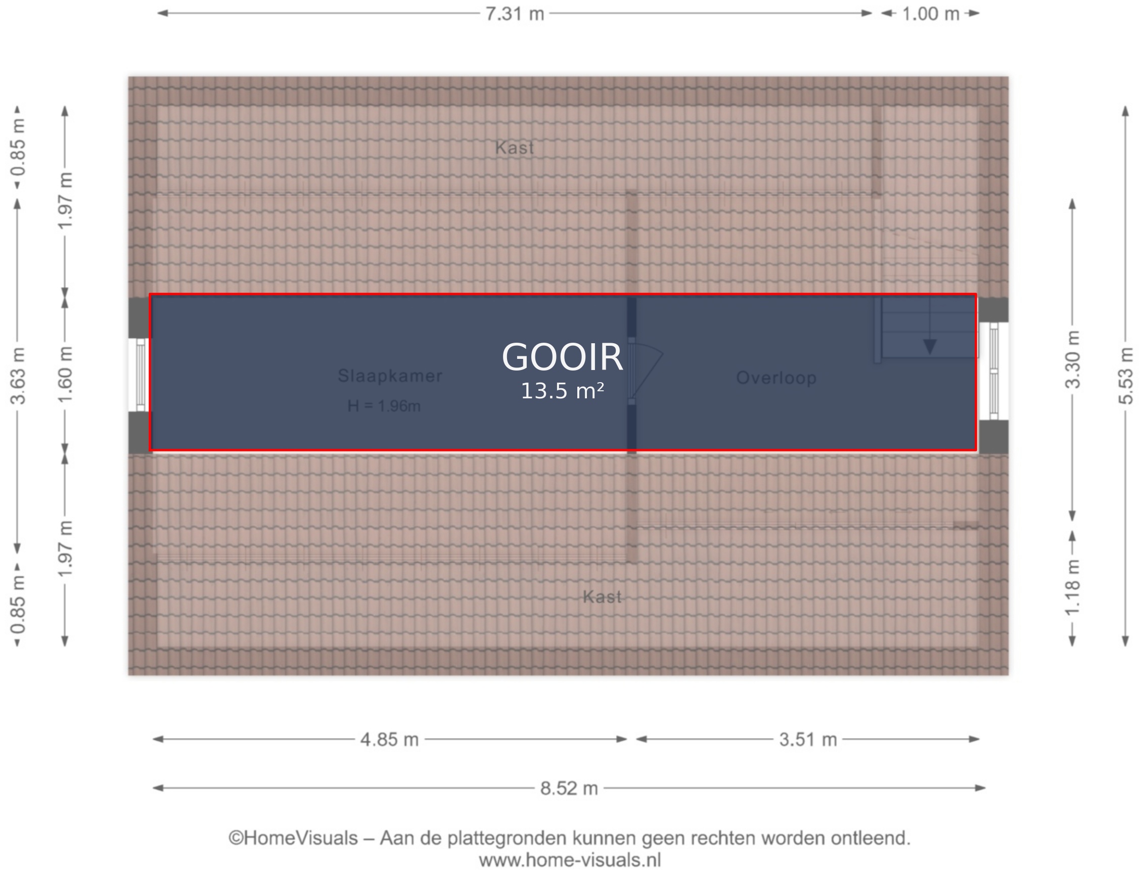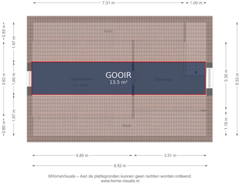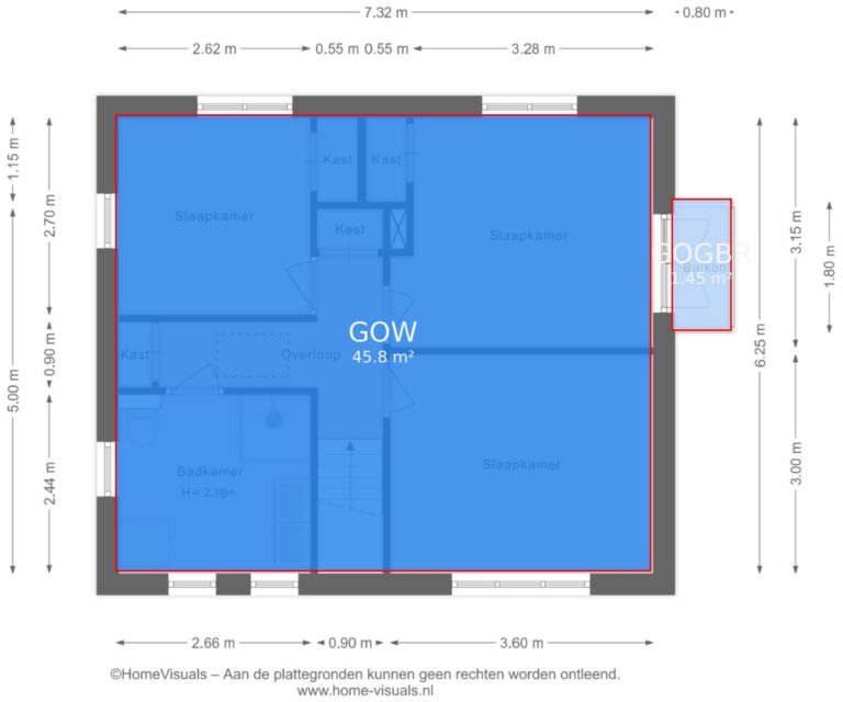 Vermelde maatvoeringen en gepubliceerde plattegronden zijn opgesteld binnen de kaders van de Branche Brede Meetinstructie; gebaseerd op NEN2580, met een onderverdeling in verschillende gebruiksoppervlakten. Omdat de publicatie ingevoerde gegevens via diverse, externe kanalen geschiedt, kan Daan Makelaars BV geen aansprakelijkheid aanvaarden voor onjuiste weergave van informatie.