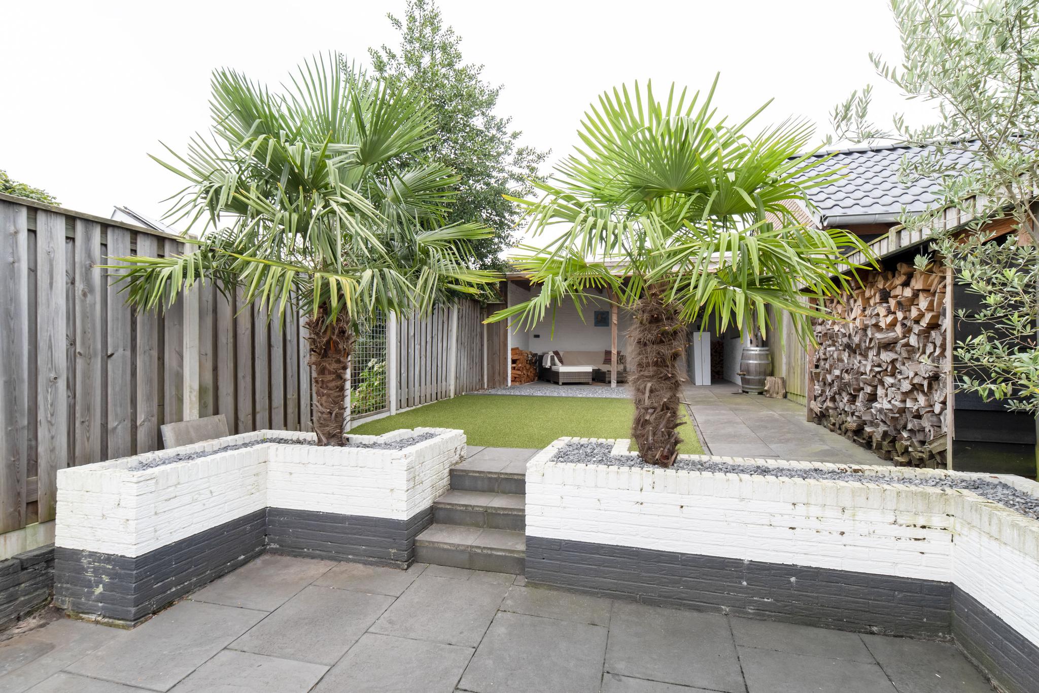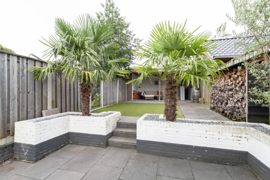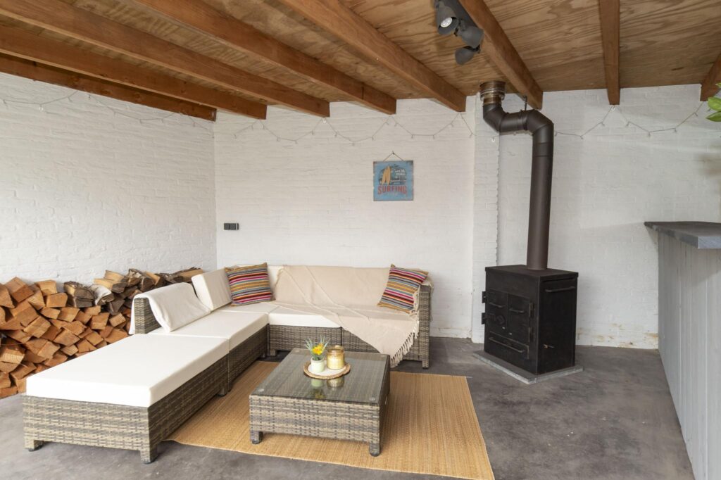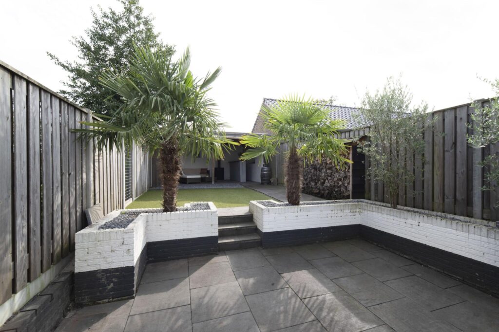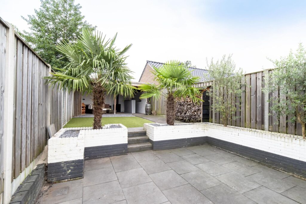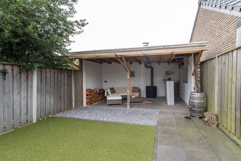 De achtertuin is een echte verrassing. Maar liefst 15 meter diep, onderhoudsvriendelijk ingericht met kunstgras, een betegeld terras en een gezellige overkapping met houtkachel. Hier zit je het hele jaar door heerlijk beschut.